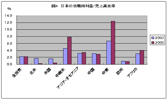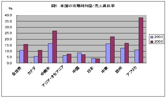 (資料) 米国商務省 経済分析局データより作成 このように米国の対外支払いの負担が減らない中で、所得収支が黒字を拡大しているのはなぜであろうか。一般には、外国に対する直接投資、証券投資等への利子・配当支払いの増大により、所得収支は既に大きく赤字転換しているはずである。しかし、現実には直接投資収益は黒字を増加させている。 国際決済銀行(BIS)の06年版76回年次報告書で米国の対外純債務残高の赤字の持続可能性について分析している。対外純債務残高のGDP比が増加しても、所得収支が黒字である理由として、米国の対外資産の多くはハイリスク、ハイリターンの直接投資から構成されており、外国の対米資産は国債などのローリスク、ローリターンのケースが多いことを指摘している。 米国の海外直接投資がハイリターンであるのは、国内よりもハイリスクであり、金融を含む知的資産やブランド力があるからである。一方、外国の対米投資に関しては、米国は流動性や保険を提供しているため、ローリターンとなっているとしている。 また、米国の海外投資は第2次大戦後から欧州などへ進出しているが、これに対して外国は80年代以降に急速な対米進出を行っており、この進出時期のズレによる成熟度の違いを収益格差が生じる要因に挙げている。しかし、近年はこの収益率の差は縮まっているとし、米国の優位性は低下していると指摘している。さらに、外国企業の対米収益が小さいのは、米国の税が高いため、在米国子会社の利益を圧縮しているためとも分析している。 同報告書では、所得収支が安定的に黒字となり、対外資産からの収益の受取が対外支払いを超過し続ける可能性についても分析している。いくつかのシナリオの内、米国の海外子会社収益率と外国企業の対米資産からの収益率格差が縮小していることを前提としたシナリオでは、所得収支が大きく悪化する可能性があることを指摘している。 米国の海外子会社の利益は拡大傾向 米国の所得収支の黒字幅が拡大しており、これは海外直接投資収益の黒字増によりもたらされている。その大きな背景として、BISも指摘するように米国の海外子会社の収益やブランド力が高いことが想定される。しかも、その収益力は国際収支統計で見る限り増加している。 日本の海外現地法人の当期純利益/売上高比率は、03年も08年においても全世界平均では2.2%であった(図4参照)。これに対して、米国の非銀行海外子会社は03年においては10.8%、08年においては15.7%と日本よりもかなり高い利益率を達成している(図5参照)。しかも、日本の海外子会社の利益率は03年から08年に変化はないが、米国の場合は5%も上昇している。 日本の海外現地法人の利益率は、中東、中南米、アフリカにおいては、03年よりも08年の方が高かった。しかし、米国、欧州においては、08年は03年よりも利益率を低めた。中国においても、同様に利益率が下落している。これは、先進国や中国のように、時には日本企業同士でも激しい競争が行われている市場において、日本企業は価格競争に巻き込まれ、利益の確保に苦慮したためと思われる。
