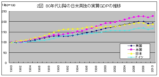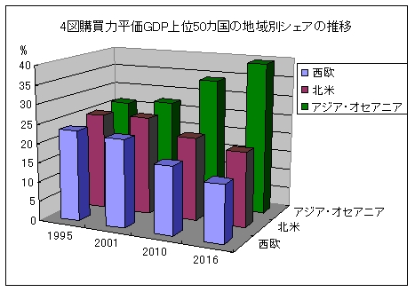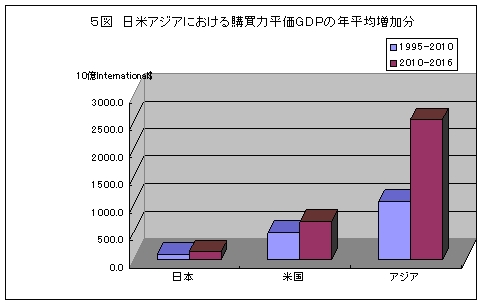 (資料) 2図と同様 2図は80年以降の日米英独の実質GDPの推移を見たものである。日本の実質GDPは他の3カ国と比較して、1991年からの20年間においてほぼ横ばいの状態が続いている。大恐慌とはいえないが、息の長いデフレが根付いている。 この間の成長の停滞は、いわゆる「失われた20年」ということになる。90年代のデフレの原因としては、不良債権処理や企業のバランスシートの改善に手間取ったことが挙げられる。これに、デフレによる投資意欲の減退、逆資産効果による消費低迷が重なった。 しかし、2000年代に入ってからのデフレはこれらの問題が解決に向かっているにもかかわらず、一向に改善の兆しを見せなかった。それは、GDPギャップ(需給ギャップ)の推移を見れば一目瞭然である。90年代半ばや90年代後半、2000年代半ば、さらにはリーマンショック後の2009年から今日における需給ギャップはGDPの4%から最大8%にまで達した。 需給ギャップがなぜ発生するかというと、供給能力に対して需要が不足しているからだ。有効需要を押し下げる構造要因には、貯蓄超過が挙げられる。つまりは、資金が国内の投資に回らず、タンスに眠っているか海外に向かっているのだ。デフレ下でも実質金利が高く、企業の投資意欲が低いことから、貯蓄超過は生産性の低下や人口の縮小とあいまって、景気の浮揚力をもぎ取ってしまう。 さらに、日本は失われた20年間において、鉄道や自動車、IT革命などに匹敵する技術革新を生むことができず、スマートフォンのような既存技術の応用においても遅れをとってしまった。2000年代の半ばには、先進国とともに新興国需要の拡大から輸出が増加したが、リーマンショックによってデフレ脱却の芽を摘み取られてしまった。直近では、2011年の大震災の発生によりサプライチェーンが寸断され、輸出が大打撃を受けている。 また、一層の金融緩和や緩やかなインフレ政策を採用したり、さらにはもっと円安政策を徹底していれば、デフレは克服できたとする見方もある。様々な要因が重なり合って、デフレが長期にわたって形成されてきたと考えられるが、それは一言で言えば、需要不足ということに尽きる。 高齢化社会を迎えて、世帯の貯蓄率が下がってきたが、企業が貯蓄超過にあり、なかなか国内の投資に結びつかないのが現状だ。したがって、大震災後の復興対策は、大恐慌時におけるTVA法などのニューディール政策に相当する最重要な需要拡大策でもあると考えられる。 ニューディール政策はその途中において、財政金融の引き締め策への転換で効力を低下させたが、もしも大震災の復興対策が適切に間断なく続くならば、日本経済を浮揚させることは疑いない。ただし、復興資金は増税でまかなわれる面もあり、その分だけ需要が削られるのは否めない。 3図はIMFの予測データに基づき、日中韓の2016年までの実質GDPの動きを示している。2010年の日本の実質GDPは、80年に対して90%増となる。これに対して、中国は18倍、韓国は7倍にも達し、文字通り桁違いの成長を遂げた。アジアの国は今後とも高成長が期待されることから、日本のデフレ脱却の鍵はこれらの国の生産・消費需要が握っているようだ。 大恐慌脱出特需とアジアの成長特需を比較 大恐慌時も日本の90年代以降も、色々なデフレ対策を講じたが、結果として決定的なデフレ脱却に直結させることができなかった。これは、政策判断が適切でなかったことや、突然の経済ショックにより、個々の対策が十分に機能する環境を整え切れなかったということにも起因していると思われる。 換言すれば、デフレからの脱却を可能にするような需要を十分に取り込むことができなかったということだ。したがって、日本の失われた20年を取り戻すには、爆発的な需要を生み出すアジア・オセアニアの成長力を取り込むことが不可欠のように思える。 4図は、1995年〜2016年までの購買力平価GDP上位50カ国の地域別のシェアを比較したものである。一目でアジア・オセアニアのシェアが、2000年代〜2010年代半ばまで、圧倒的に高まることが見て取れる。2011年以降の結果は、IMFの2011年4月時点の予測であるため、米欧の財政問題の深刻化や中国の成長率の低下などの最近の世界経済の低迷を明示的に盛り込んでいない。しかし、それでもアジア経済が相対的に中期的には比重を高めることは間違いないものと思われる。 上位50カ国に入ったアジア・オセアニアの国を合計したシェアは、1995年には50カ国全体の26.1%であったが、2016年には39.4%にまで高まる。これに対して、西欧は、23.4%から14.7%に減少する。北米も、25%から19.4%に縮小する。 この結果から日本、米国、アジア・オセアニアだけを取り出し、1年間にどれだけ購買力平価GDPを増やすのかを見たのが5図である。アジア・オセアニアの購買力平価GDPは1995年〜2010年までは年間1兆ドル増えたが、2010年〜2016年までは毎年2.5兆ドルも増加する(注1)。 ちなみに、米国は、それぞれ5,000億ドル、7,000億ドル、