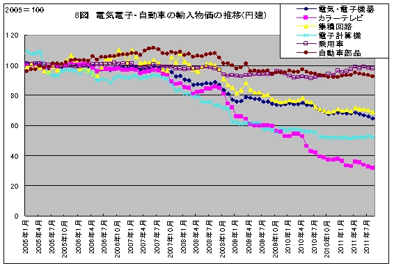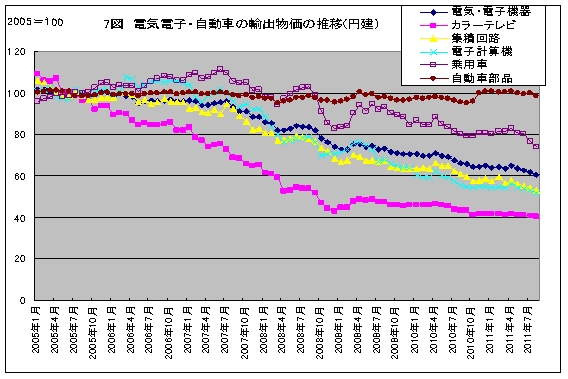 (資料) 1図と同様 これに対して、大恐慌後の第2次大戦時(1940年〜1944年)の米国における実質GDPの年平均増加額は2,000億ドルであった(6図参照)。戦勝国である英国はわずかに年間80億ドルの増加であったので、いかにこの戦争特需が米国経済の大恐慌脱出に大きく貢献したかをうかがい知ることができる。 6図の大恐慌時の数字は1990年価格実質GDPであり、5図の95年以降の値は購買力平価GDPであるため、両者の統計は同じGDPを取り扱っているものの、概念や作成方法に違いがある(注2)。両者の統計には違いがあるものの、大恐慌後の特需とアジア成長特需を比較するため、米国の大恐慌特需が2010年に換算すればどのくらいの規模になるかを試算した。 すなわち、米国の2010年の購買力平価GDP 14兆6,578億ドルを1940年の実質GDP 9,297.4億ドルで割り(=15.8倍)、米国の1940年以降における年平均のGDP増加額2,000億ドルに乗じることにより、大恐慌特需の2010年換算額である3.2兆ドルを得た。 したがって、前述のようにアジア成長特需は2.5兆ドルであるので、これは大恐慌特需の2010年換算額の3.2兆ドルに近い規模を有しているということになる。しかし、大恐慌特需は主に政府支出の増加を通じて米国のGDPそのものを引き上げたが、アジア成長特需に関しては、日本の成長に取り込まなければその効果は現れない。そのためには、アジア市場に積極的に投資し、同時に輸出を増やすことが不可欠となる。 大恐慌後の特需により米国は年平均16.5%もの高成長を遂げたが、現在においては、日本はその5分の1でも成長に取り込めれば、毎年実質3%以上もの成長を達成することも可能だ。 日本のデフレ脱却にどう生かせるか〜円高でも輸出は拡大できるか〜 日本企業はもう既に円高を活用して、アジアや先進国で積極的に海外展開を図りつつある。海外市場を取り込むことは企業の生き残りに不可欠として、外国企業の買収が増えているし、グローバル人材の登用にも取り組み始めている。 海外投資の促進という観点に立てば、これから拡充しなければならないのは、中小・中堅企業への支援体制であろう。最近のアンケート調査によれば、中小・中堅企業の海外投資意欲は急速に高まっているようだ。この期待に応えるには、海外投資に関するアドバイス機能やアジア投資市場に関する情報提供の拡充が求められる。 また、政府は円高対策の一環で、企業に低金利で融資することを目的とした1,000億ドルの基金の創設を決定した。これは、外国為替資金特別会計が保有するドルを活用し、日本企業による海外企業の買収や資源・エネルギーの確保を後押しするものだ。このような円高対策を兼ねた海外投資の支援策も、効果的と考えられる。 しかし、海外投資の進展だけでは国内生産の拡大や雇用の創出を十分に生み出すことはできない。大恐慌からの脱出時において、米国は中南米という経済圏を中心とする輸出の拡大を図った。同様に、日本もアジア・オセアニアという経済圏を核とした輸出戦略が求められる。輸出は国内の生産を高め、雇用の創出に効果的だ。 総務省発表の平成17年産業連関表によれば、輸出の生産誘発係数(最終需要が1単位増えたときに、どれだけの生産を誘発するかを示す係数)は2.2であり、消費の1.5を上回る。すなわち、国内消費の拡大よりも、輸出が増加した方が、生産の拡大に与える影響が大きいのだ。 しかし、輸出の拡大を巡っては2つの点でその進行を阻む要因がある。1つには、これまで日本は米国からの輸出削減要求を多く受け入れてきたため、積極的に輸出の振興を掲げることにためらいがあることだ。2つ目には、当面は円高が続くということである。 輸出に対して罪悪感を持つことは、もはやあまり意味がないと思われる。日本のGDPに対する輸出比率はASEAN、韓国、はもちろんのことドイツなどと比べても低いし、米国のオバマ政権そのものが5年で輸出倍増を掲げている。資源価格が上昇し、日本の貿易黒字は縮小傾向にあり、特に大震災の影響から輸出の立て直しは急務である。経常黒字は貿易黒字よりも所得収支の黒字が支えている状態だ。 問題は円高である。もしも、アジア特需を日本の成長に取り込むことができれば、デフレからの脱却が進展し、自然に円安に振れていくものと思われる(注3)。また、欧米経済が回復し、金融引き締めに転換すれば、金利差の拡大から、円安に向かうものと思われる。しかし、現下においては、当面は円高を覚悟しなければならない。 円は2002年には125円であったが、2005年には110円、2009年には100円を割り94円、2010年には88円と円高基調を強めた。2011年に入ると一段と円高が進み、8月の時点で77円をつけている。したがって、円は2011年8月の時点で、2005年に対して3割も上昇したことになる。 輸出物価は円ベースで同じ期間において15%減少した。輸入物価は、資源価格の上昇から逆に20%の増加となった。輸出物価の中でも、電気・電子機器の価格は同期間で4割減、中でもカラーテレビ