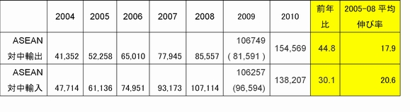 (2/5ページ) 2.関税削減の効果が現れ始めたACFTAと日系企業の対応 動意が見られるASEANと中国との貿易 ACFTAの域内貿易の割合は2割強であり、EUやASEAN域内と比べて相対的に低い。もしも、ASEAN域内を除くならば、その割合は半分にまで低下する。 その理由の1つとして、ASEANと中国との貿易が「素材や電気電子部品」を輸出し、「繊維製品や電気製品」を輸入するというように、まだ異なる業種間で行われていることが多いためと考えられる(垂直的分業)。もしも、「一般・工作機械」や「自動車部品」などの同じ業種内で貿易が進展すれば(水平的分業)、ASEANと中国との貿易はさらに拡大するものと思われる。 また、分業体制だけでなく、関税削減スケジュールでAFTA( ASEAN自由貿易地域)に比べて遅れていることも、現段階でACFTA域内貿易の割合が相対的に低い原因と考えられる。AFTAの共通実効関税制度(CEPT)は93年から発効し、2010年には先行6カ国(ブルネイ、インドネシア、マレーシア、シンガポール、タイ、フィリピン)の域内関税は例外を除きほぼゼロになっている。 これに対して、ACFTAは2005年に発効したばかりである。このため、中国とASEAN先行6カ国においては、早期に関税を引き下げるアーリーハーベスト品目(EHP、主に農水産物やその加工品)の関税が2006年にゼロ。2010年には、一般スケジュールどおりに関税削減を実施する自由化品目(ノーマルトラック、NT)の関税がゼロになったばかりである。 したがって、ACFTAにおいては、依然として全体のおおよそ4分の1を占める「EHP例外品目」、「NTの例外品目(NT2)」、及び一般スケジュールよりも自由化を遅らせる「センシティブトラック品目(ST)」に関しては、中国とASEAN先行6カ国でも関税撤廃はこれからである。 いわんや、その他のASEAN諸国である「CLMV(カンボジア、ミャンマー、ラオス、ベトナム)」のACFTAにおける関税自由化は、EHP品目では2010年に関税は撤廃済みであるものの、NT品目でもその関税は2015年からゼロとなる予定である。 AFTAと比べて、ACFTAの関税削減スケジュールの遅れは顕著である。しかしながら、実際のASEANと中国との貿易には、2010年に入り動意が見られる。 2010年のASEANの対中輸出は、中国統計から見ると、前年から44.8%の増加となった。対中輸入も30.1%増であった。2009年はリーマンショックの影響から、輸出入は共に前年から減少したが、2010年には大きく反転したといえよう。それは、ASEANや中国の高成長やリーマンショックからの反動を反映しているだけではなく、中国と先行ASEAN6における2010年のNT品目の関税撤廃も影響を与えていると考えられる。 また、ASEANの対中輸出の2005年から2008年までの平均伸び率は17.9%増であり、ASEANの対中輸入は20.6%増であった。2010年の対前年伸び率は、この3年間の平均上昇率よりも倍近くも高い。2010年の前年比とこの過去3ヵ年の平均伸び率と比較することにより、2010年の関税自由化の効果がさらに明白になる。 表2 ASEANの中国との貿易(100万ドル、%)