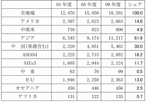 (注) 2009年のASEAN対中輸出入の( )内の数字は、2004-08年までと同様にASEAN貿易データベースの値。2009年、2010年の( )を除く「ASEANの対中輸出入額」は、中国通関統計から得た。2009-10年のASEANの対中輸出は、中国の対ASEAN輸入(CIF)なので、運賃・保険の分だけ数字が膨らむ。 (資料) ASEAN Trade Statistics Database (Data as of July 2009)、日本貿易振興機構 J-fileより作成 ASEANは素材・中間財、中国は最終製品を供給 表2のように、約6、000品目にも達する2010年におけるNTの関税撤廃の効果が、「中国からASEANへの輸出」よりも「ASEANから中国向けの輸出」の方に強く現れている。これは、中国の2010年における内需の活発化の影響を受けているものと思われる。 2010年の「ASEAN10から中国への輸出」においては、加工品や部品から成る「中間財」の割合が多くを占め、7割に達した。中間財の内訳を見ると、加工品が全体の19%、部品が41%であった。部品の比重が高いことがうかがえる。 乗用車や衣類、食料品などの「最終財」は2割。食料・飲料の原料、あるいはプラスチック・塗料などの産業用原料に代表される「素材」は1割であった。 これらのASEANから中国への輸出において、特に増加しているのは素材である。2005年から2010年にかけて、ASEANの中国への素材輸出は140%も増加した。中間財は97%増、最終財は94%増であった。素材の輸出増には、現地日系企業も貢献しているものと思われる。 一方、2010年の「中国からASEANへの輸出」において、素材のシェアはたったの1%にすぎない。中間財のシェアも54%であり、7割に達するASEANから中国への輸出における中間財のシェアに比べると、その割合は低い。 中間財の内訳を見ると、加工品が28%、部品が21%であった。したがって、中国からASEANへの中間財輸出においては、加工品の比重の方が高い。これは、逆のケースであるASEANから中国への中間財輸出においては、部品の比重が高かったことと比較すると、大きな違いとなる。 また、中国からASEANへの輸出においては、最終財のシェアが高く、45%に達する。すなわち、中国からASEANへの輸出においては、そのほとんどを中間財と最終財が占めており、その両者の割合はあまり変わらない。 中国からASEANへの最終財の輸出においては、2010年には2005年から3倍に増加している。中間財は2倍であった。このスピードで進むならば、いつかは最終財のシェアは中間財を上回ると思われる。 したがって、ASEANと中国との経済貿易構造における特徴として、ASEANから中国へ素材や中間財を供給し中国で組み立てを行っていること。さらに、中国からASEANへの輸出において、加工・組み立てを終えた最終製品を供給するという傾向が強まっていることを、挙げることができる。 また、中間財貿易だけを見ても、ASEANから中国へは部品の割合が高く、中国からASEANへは逆に加工品の比重が相対的に高い。すなわち、ASEANと中国との貿易構造は補完的であることを示唆している。 ACFTAの活用対象の日系子会社は9,000社 日本企業の海外現地法人企業数は、経済産業省によれば、2009年度で1万8,201社(報告ベース)であった。このうち中国(香港含む)に進出している企業数は5,452社、ASEAN4(タイ、マレーシア、フィリピン、インドネシア)へは2,952社であった。したがって、アンケートに報告していない企業や他のASEAN諸国を考慮すると、ACFTA域内で活動している日系企業は、少なくとも9,000社は存在すると想定される。 ACFTA域内に進出している日系企業の全てが国境を超えて取引をするわけではないし、1つの日本の親会社が複数の子会社を抱えていることもあり、9,000社の全部がACFTAを活用することはない。しかし、相当数の進出企業が潜在的な活用対象企業であることは間違いない。 この9,000社は、日本企業による全世界への進出企業数の半数にも達する。したがって、ACFTAの活用は、日本企業にとって非常に大きな意味を持っている。 表3 日本企業の海外現地法人企業数