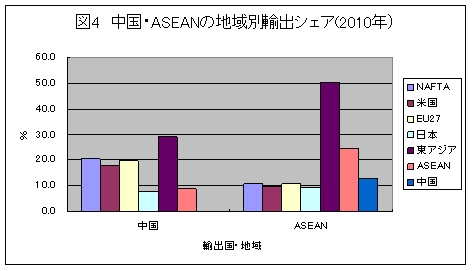 資料) 経済産業省 第40回海外事業活動基本調査 2010年7月、より作成 一層のACFTA活用が期待される日系現地法人 実際に、ACFTA域内に進出した日系企業は、域内貿易をどの程度行っているのであろうか。図3は、日本企業の中国現地法人の売上・仕入全体に占める「アジア」との売上・仕入のシェアを示したものである。本来ならば、中国現地法人の「ASEAN」との売上・仕入のシェアを見たいところであるが、残念ながら、中国現地法人の「ASEAN」との取引の数字は公表されていない。 中国現地法人の2009年度におけるアジア向け売上のシェアは12.3%であり、仕入のシェアは12.8%であった。これに対して、図4のように中国の全輸出に占める対ASEAN輸出のシェアは、2010年で8.7%、ASEANの全輸出に占める中国向けのシェアは12.7%であった。 日本の中国現地法人の売上・仕入は、「アジア」との取引である。もしも、「アジア」を「ASEAN」に置き換えた場合のシェアを推測すると、韓国・台湾・インドなどが抜けるため、半分近くに下がる可能性がある。 したがって、日本の中国現地法人のASEANとの売上・仕入のシェアが、中国とASEANとの輸出入のシェアと比較して、同等かそれを下回る可能性がある。ACFTAは日本企業の活用を目的としたものではないが、大きな影響力を持つ日系現地法人の一層の利用拡大が望まれる。 ASEANに進出した日本法人の中国との取引が公表されていないため、ACFTA域内に進出した日本企業全体の行動パターンを反映した結果を知ることができない。おそらくは、日本企業の現地法人によるASEANから中国への売上のシェアは、中国からASEANへの売上シェアよりも高いと想定される。 それでも、ACFTA域内に進出した日本企業がASEAN−中国間の貿易で圧倒的に取引を主導しているとは言えないと思われる。念のため、「日本企業の中国現地法人のアジアとの売上・仕入額」を「中国と東アジア(インドを除く)との輸出入額」で割ったシェアを算出した。 2010年の中国から東アジアへの輸出額は4,576億ドルで、中国現地法人のアジアへの売上額は464億ドル(2009年度)であったので、日本企業が貢献した割合は10.1%であった。逆に、東アジアから中国への輸出額は5,427億ドルで、中国現地法人のアジアからの仕入額は346億ドルであったので、日本企業が貢献した割合は6.4%であった。 すなわち、進出した日系企業の売上が中国とアジアとの貿易取引において貢献した割合は、大雑把に言って、1割程度と見込まれる。