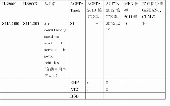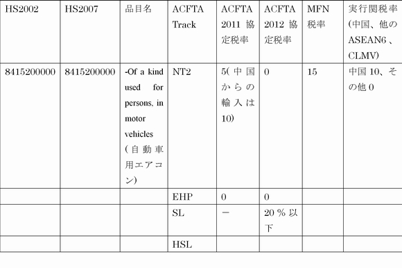 (注1) 中国のTRS表には2011年のST品目の年別税率削減スケジュールが明示されていない。掲載されているのは、2010年と2012年のみ。したがって、2011年においては、上限はMFN税率とするが、これを超えない限り規定を超えた運用ではない。なお、議定書では、SLについては2012年から20%以下、2018年から5%以下、HSLについては2015年から50%以下と規定。また、TRS表には、SLとHSLの区別がないので、エクセル表のTrack欄に記載するときは修正議定書のSL、HSLリストを参照にして分類。 (注2) 中国のEHPはTRS表には掲載されていないので、議定書、修正議定書のAppendix等を参照しながらエクセル表に書き込む作業が必要。 (資料) 中国TRS表と物品貿易協定書・修正議定書、実行関税率表より作成。 次に、同じ製品のインドネシアにおける協定税率と実行関税率を検証してみた(表7)。インドネシアでは、自動車用エアコンのHS番号は8桁までは中国と同じであるが、10桁で表示されている。当然であるが、インドネシアでも、HS2002とHS2007は同じ番号である。 インドネシアのTRS表は他のACFTA各国と比較して、例外といえるほど非常に良くできており、作業が容易であった。同製品のインドネシアにおける品目トラックはNT2である。TRS表では、ACFTAの協定税率は5%となっているが、中国からの輸入に対しては10%と規定されている。 したがって、他のASEAN諸国からの自動車用エアコンの輸入では5%が課税されるが、中国からの輸入品に対しては、10%の関税が賦課されると見込まれる。ちなみに、ACFTA域外国に適用されるMFN税率は表からもわかるように15%であった。 中国からの自動車用エアコンの輸入に対するインドネシアのACFTA協定税率が、きちんと運用されているかどうかを検証するため、実行関税率をチェックした。インドネシアの関税率表によれば、中国への実行関税率は10%で他のASEANに対しては0%であった。 したがって、インドネシアにおける、中国からの自動車用エアコンの輸入におけるACFTA協定税率は、TRS表どおりに運用されていることが判明した。他のASEAN諸国からの輸入に関しては、協定税率は5%と規定されているが、実際には関税率表では0%となっている。 インドネシアは、他のASEAN諸国からの同製品の輸入に関しては、自由化が進んでいるAFTAを考慮し、ACFTA協定税率の5%を無視して関税をゼロにしたと考えられる。 表7 インドネシアのACFTA協定税率と実行関税率