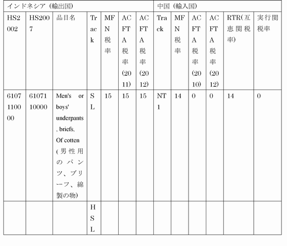 (注) 中国のST品目の協定税率の削減目標がTRS表には明示されていない。 (資料) 物品貿易協定書・修正議定書、中国・インドネシアTRS表、中国・インドネシアの実行関税率表より作成。 次に、表9においては、表8とは逆に「輸出国がインドネシアで中国が輸入国の互恵関税率と実行関税率」を取り上げている。品目は「男性用のパンツ、ブリーフ、綿製の物」である。HS番号は、6107110000である。インドネシアではSL品目、中国ではNT1 に指定されている。 輸出国であるインドネシアの同製品における協定税率は15%であり、中国は0%であった。したがって、インドネシアの関税率は10%を超えているので、互恵関税率は自動的に輸入国である中国のMFN税率が適用される。 同製品の中国のMFN税率は14%であるので、互恵関税率は14%ということになる。中国の、同製品の2011年の実行関税率は0%であるので、表8のケースと同様に、中国においても、互恵関税率を適用せず、実際の実行税率は自由化のスケジュールどおりに0%を当てはめている。 表8も表9のケースも、いずれも互恵関税率を適用しておらず、関税は0%となっている。したがって、ACFTAにおいては互恵関税率の規定を無視し、自由化を積極的に進めているのではないかと思われるかもしれない。 しかしながら、他の品目全体を検証してみると、実際にはかなりの割合で互恵関税率が適用されていることがわかっている。むしろ、通常のACFTA協定税率の運用が守られていないことのインパクトよりも、互恵関税率を適用していることの影響の方が大きいと考えられる。この意味において、日本企業にとって、互恵関税率の適用をきちんと検証することが非常に大事である。(了) 表9 インドネシアが輸出国で中国が輸入国の場合の互恵関税率と実行関税率