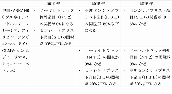 (注1) ACFTAにおいては、関税削減対象品目は、早期に関税を引下げる「アーリーハーベスト品目(EHP)」、一般スケジュールどおりに段階的に削減し最終的に0%にする品目である「ノーマルトラック品目(NT)」、ある期間までに一定の関税率まで引下げることを猶予される「センシティブトラック品目(ST)」に分類される。 (注2)ノーマルトラック品目((NT)は、予定通りに関税削減する品目(NT1)とノーマルトラックの例外品目(NT2)に分類される。センシティブトラック品目(ST)は、センシティブリスト品目(SL) と高度センシティブリスト(HSL)品目、に分けられる。HSL品目は、SL品目よりもさらに関税削減スケジュールが遅れる。 |