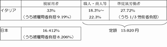 はじめにかつてイタリアには「ベビー年金生活者」という言葉があった。女性公務員の場合は特に優遇され、事実、40才前から受給者が続出した時代があった。それは「暑い秋」と言われた1969年の労働運動が吹き荒れた後にやって来た「労働者天国」の申し子だったのかも知れない。 しかし、それから40年、イタリアの年金制度は様変りしており、改革に次ぐ改革は、2011年末のフォルネーロ(注:イタリア切っての年金専門家。現「福祉・機会均等相」)改革で一段落した。 以下はイタリアの公的年制度の概容である。 1. 公的年金制度の日伊比較(1)被保険者 日本は全国民が制度の対象となっているのに対し、イタリアの対象者は、あくまで「就労者」だけである。「就労者」とは、すべての被雇用者と大部分の自営業者からなる。 自営業者には、商人、職人、自営農林水産業者と「準従属労働者」が含まれ、この「準従属労働者」とは、企業の取締役、監査役などが該当し、通常、経済的な従属関係が残る企業内の役職者を指す。 なお、企業は社会保険料の負担をまぬがれるため、経営陣を自営業者に繰り入れる弊害を避けるべく、1995年のディーニ年金改革で年金加入が義務づけられた。 (2)就業者の現行保険料率 (表)各種就労者の保険料率