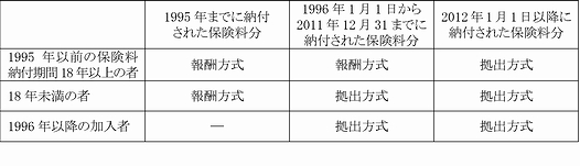 上表の通り、一般の被雇用者については、イタリアの保険料率は企業側も本人負担分も日本より高い。いわゆる自営業者については日伊で単純な比較はできない。 2. イタリアの年金固有の問題(1)年金算定の仕方の推移 イタリアでは1995年までは「報酬方式」が採用されており、年金計算に際し、年金受給前に受け取っていた報酬額に比例させる仕方で、次の計算式がとられていた。 現役時代の年収額(税控除前)の平均 × 保険料納付年数(最高40年)× 支給率(原則2%)= 年金額(平均年収の80%に相当) しかし、その後、段階的に報酬方式から拠出方式へと転換(下表参照)が進み、本年1月以降はすべて拠出方式に変った。