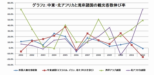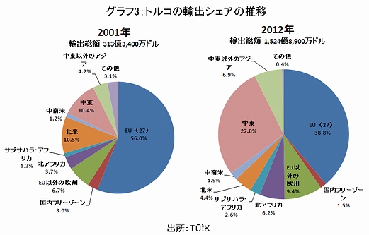 <ドラマはトルコ製品の広告塔>ドラマは、トルコの製品とライフスタイルを最も魅力的に紹介するマーケティングツールとしても機能している。トルコ国内で、ドラマのヒロインが身に着けた服、靴、アクセサリー、ドラマで使われた食器や家具などの売り上げが急増するのはよくあることだが、中東諸国からも「同じものを自国で買いたい」という引き合いが数多く寄せらせられるようになった。ドラマを見て、「憧れの地」イスタンブルで結婚式を挙げたいと望む外国人カップルも増えている(注18)。 こうした流れを「トルコ製品売込みの千載一遇のチャンス」ととらえたチャーラヤン経済相は、10年1月に「競争力の高い輸出コンテンツに成長したテレビドラマを使って、戦略的にトルコの製品とライフスタイルを売り込む」方針を明らかにした(注19)。これを受けて12年6月に経済省がサービス輸出支援法を施行、医療、教育サービス、情報通信、映画・ドラマの輸出に5年間で1億ドルの助成金交付を開始した(注20)。 01~12年のトルコの輸出推移をみると、輸出総額が年平均14.9%伸びたのに対し、中東諸国向けは39.9%、北アフリカが25.2%、EU以外の欧州が21.0%の伸びとなっており、結果としてこれら3地域のシェアは大きく拡大している(グラフ3)。3地域への輸出拡大は、2000年代に中東やバルカン諸国との間に自由貿易協定(FTA)が次々発効したことに加えて、02年に誕生したイスラム系・公正発展党(AKP)の現政権が、外交の柱として近隣諸国との経済関係強化に努めた成果である。その一方で、トルコドラマの放映もこの3地域に集中しており、トルコ製品のブランドイメージ向上に果たした役割は決して小さくないと推測される。 またドラマは、消費だけでなく投資の呼び水ともなった。12年5月に外国人の不動産取得が解禁されると、ドラマの撮影に使われたような、ボスフォラス海峡に面した古い邸宅(トルコ語でヤル(Yalı))を買い求めるアラブの富豪が次々と現れ、中間層でもイスタンブルや地中海沿岸のリゾート地・アンタルヤにセカンドハウスを購入する動きが相次いだ(注21)。アラブ人がイスタンブル観光の折に、ショッピングモールで大量の買い物をすることに目を付けたクウェート資本は、イスタンブルの代表的なショッピングモールCevahirを買収、店内ガイドマップやショーウインドウにアラビア語を追加し、アラビア語の堪能なスタッフを配置するなど買い物客の便宜を図っている(注22)。
