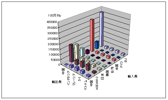 中国の国別輸出で注目されるのは、韓国向け輸出の割合がドイツよりも高いことである。2011年で829億ドルの4.4%に達し、ASEANや日本の約半分の水準であった。中国の輸出はEUや米国向けの割合が高く、ASEANや日本の倍であった。つまり、中国は最終消費地向けの輸出基地になっていると考えられる。 これに対して、インドネシアの輸出は中国と違い、ASEAN向けの金額が420億ドルと最も高く、2011年の総輸出額(2,035億ドル)に占める割合は20.7%にも上った。これは、インドネシアのASEAN域内のサプライチェーンに組み込まれた貿易が活発であることを示している。2番目の輸出相手先は日本で、その輸出額は340億ドルで、全体に占める割合は16.6%であった。中国向け輸出のシェアは11.3%、EU向けは10.1%、米国向けが8.1%であった。 インドネシアで注目されるのは、やはり韓国向け輸出の割合で、米国と同率の8.1%であった。中国同様に、インドネシアでも、韓国はASEANと日本向け輸出の約半分のシェアを占めた。 マレーシアの輸出はインドネシア以上にASEANへの輸出割合が高い。2011年の総輸出額(2,283億ドル)に占めるASEANへの輸出シェアは24.6%であった。中国向けは13.1%、日本向けは11.6%、EU向けは10.3%、米国向けは8.3%であった。韓国向けのシェアは3.8%で、インドネシアや中国ほどは高くはないものの、一定の割合を占めた。ちなみに、台湾向け輸出のシェアは3.3%と韓国とほぼ同じであった。 タイの総輸出額(2,204億ドル)に占めるASEANへの輸出の割合は24.3%で、インドネシア、マレーシア同様に、他の国・地域よりもシェアが高かった。中国向けのシェアは11.8%であり、EUが10.9%、日本は10.7%、米国が9.8%と同じような水準となっている。韓国向けのシェアは2.1%であり、タイの韓国への輸出割合はACFTA5カ国の対韓輸出の中では最も低い。 ベトナムの総輸出額(956億ドル)に占めるASEANの割合は14.2%であり、インドネシア、マレーシア、タイと比べると低い。その分だけ、米国向けが17.7%、EU向けが17.1%と高くなっている。中国向けは11.5%であり、日本の11.3%とほぼ同じであった。韓国向けは4.9%に達しており、ベトナムにおいても韓国向けの輸出割合の高さが目立っている。 (2)中国は日米独には最終財、韓国・台湾には中間財を中心に輸出 表3は、2011年のACFTA5カ国の国・地域別輸出の財別構成比をまとめたものである。同表によれば、中国の対世界への輸出では、既に見たように、最終財の割合が6割弱、中間財が約4割であり、素材は1%程度である。こうした全体の傾向は、中国の日本や米国、及びドイツなどの先進国向けの輸出構造を色濃く反映したものである。 中国の日本向け輸出に占める最終財の割合は6割であり、ドイツ向けは64%であった。米国向け輸出に占める最終財の割合は7割であった。このように、中国のこれらの国への最終財における割合が高いことから、中間財の輸出割合ではいずれも30%台にとどまる。 これに対して、中国のASEAN10への輸出においては、中間財の割合が54%と高いものの、最終財も46%であり、両者にそれほど違いがない。中国の韓国向けや台湾向けの輸出では、中間財のシェアは6割を超え、最終財は3割台に低下する。つまり、中国の輸出においては、日米欧には最終財中心であり、韓国・台湾へは中間財中心ということになる。 このことは、後の分析でも触れるが、中国は日本や韓国、ASEANなどから素材・中間財を輸入し、それを加工して日米欧に最終財を輸出するという貿易構造にあることを示唆するものである。 また、2011年のインドネシアの財別輸出の特徴を見ると、中国への素材輸出の割合は6割近くにも達しており、ASEAN向けでは3割となる。インドネシアの対日輸出額に占める素材の割合は35%であるが、韓国・台湾では4割を超える。 2005年においては、インドネシアの中国への素材輸出の割合は32%であり、2011年よりも26%も低かった。また、ASEAN向けの素材輸出の割合は15%であったので、2011年よりも15%も低かった。しかし、これらの国以外では、2005年と2011年のシェアの値にはあまり変化がない。したがって、インドネシアの中国とASEAN向けの素材輸出は、他の国・地域よりも2005年以降に大きく拡大したことになる。中国とASEANはそれだけ素材(燃料・潤滑剤)を消費したり、あるいは素材(産業用資材)を加工し中間財を生産する体制を築いたということだ。 マレーシアの中間財の輸出割合は高く、中国、ASEAN、日本、韓国、台湾向けは7割を超える。タイでは、ASEAN向けと台湾向けの中間財の輸出割合が高く、6割を超える。 ベトナムでは、中国向けと韓国向けの素材の輸出割合が高い。中間財の輸出割合は相対的に低く、ASEAN向けでも44%にとどまっている。 これは、インドネシア、マレーシア、タイと比較すると、ベトナムの輸出は加工品や部品などの中間財におけるASEAN域内のサプライチェーンにまだ十分には組み込まれていないことを示唆している。また、ベトナムの米国やEU向けの中間財の輸出割合は1割程度にすぎなく、その結果、最
