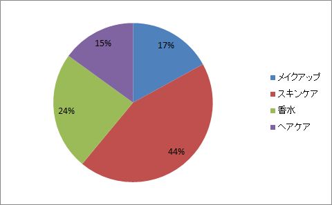 商品カテゴリー別のシェアはアジア太平洋市場の需要が多いスキンケア市場は40%、790億ドル、次いでヘアケア市場は25%、500億ドル、メイクアップ市場は19%、380億ドル、香水市場は16%、320億ドルである。(図2参照) 図2