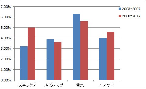 一方、アジア市場は特にスキンケア市場が金融危機以前は3.2%増であったのが、2008~2012年は5.0%増と大きく成長している。先に述べたように先進国のメーカーがアジア地域に参入している理由はここにある。(図5参照) 図5 アジア太平洋市場のカテゴリー別成長率