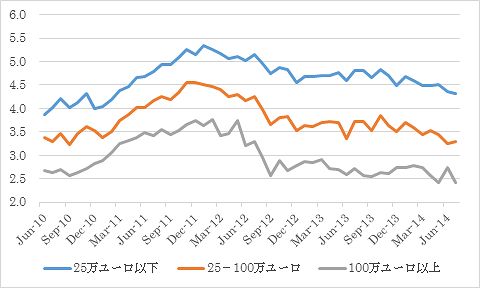 1.はじめに9月18日に実施された第1回目のターゲット長期オペ(TLTROs:Targeted Longer-Term Refinancing Operations:テルトロ)は826億ユーロという結果となった.ドラギ総裁は,第1回目には4000億ユーロの利用が可能で,以降の2年間で最大で1兆ユーロの資金供給が可能だといっていたことと比べると,わずかの利用にとどまったといえるだろう.フラッシュNo.197では,ターゲット長期オペは空振りの可能性が高いと指摘したが,その通りの結果となった. ECB(欧州中央銀行)は,2014年6月5日にターゲット長期オペを導入した.これは,ユーロ地域(euro area)の金融機関に対して,住宅ローン以外の形で貸出を増やすように促す政策である.また,2014年6月5日と9月4日に政策金利を引き下げ,中心となる政策金利は0.05%,預金金利は-0.20%まで引き下げられている.これらの政策は,ユーロ安を誘導し,デフレ懸念を払拭するためのものであると説明されているが,実のところは単なる景気支援策であるといえる. 本稿では,9月18日に実施された第1回目のターゲット長期オペの結果を考察するとともに,ユーロ地域の銀行貸出の状況を合わせて検討し,ECBの政策効果について明らかにする. なお,ユーロの金融政策主体はユーロシステム(Eurosystem:ECBにユーロ導入加盟国中央銀行を加えたもの)であるが,本稿では日本でよく使われているECBを用いることにする. 2.ターゲット長期オペ(TLTROs)の結果第1回目のターゲット長期オペは9月16日にオペの実施がアナウンスされ,9月18日に入札,資金が供給された.入札に参加可能な代表銀行は382だが,実際には255の代表銀行が参加した.ターゲット長期オペに直接参加できない中小銀行は,オペに直接参加できる銀行とグループを形成して間接的にオペに参加することができる.このケースでオペに直接参加できる銀行のことを代表銀行という.本稿執筆時点では詳細な情報が入手できないが,自らの資金需要ではなくグループ内の中小銀行の要請によってオペに参加した代表銀行も相当数に上ると思われる. オペで供給された資金は826億ユーロである.この金額の水準自体は小さくはないが,例えば,9月3日の主要オペ(MRO,満期は7日間)では,1111億9900万ユーロの資金が供給されている.この数字と比較しても826億ユーロは,ECBの資金供給の中では小粒だといえるだろう.ECBはターゲット長期オペで大幅な資金供給を実現させ,この資金を民間経済に流し込むことで景気浮揚をもくろんでいたが,初めの第一歩でつまずいたといえるだろう. ターゲット長期オペのルールでは,銀行は今回のオペと12月の次回のオペで2014年3月末時点の貸出残高の7%までECBから資金を借り入れられる.つまり,今回,借り入れ上限に達していない銀行は12月のオペで資金を借りられるため,ECBにはまだ資金を供給するチャンスがある. その一方で,銀行は資金の繰り上げ返済ができる.今回ターゲット長期オペで借り入れた資金は4年間借り続けることができるが,2年間の据え置き期間を経て2016年9月には繰り上げ返済が可能となる.この点では,ECBの資金供給策は早めに効果を失うことも考えられる.事実,2011年と12年に実施された満期3年の長期オペ(LTRO)は繰り上げ返済が相次いだ. ターゲット長期オペが景気浮揚策というのは,そのルールにある.オペで資金を調達した銀行は,2年後の2016年9月の時点で貸出実績を審査される.特殊な計算方法によって算出された基準額を下回ると,今回借り入れた資金を2016年9月の時点で全額返済しなければならない.(ルールの詳細については,フラッシュNo.197を参照)この基準額は,「ターゲットオペに参加するならば,貸出を増やしなさい」という意図で設定されており,銀行は2年後まで貸出残高を増やし続ける,または少なくとも貸出残高を減らさないようにしなければならない. これは,マクロ的には貸出増→景気回復という道筋を考えることもできるが,銀行の経営を縛ることにもなる.このような縛りを嫌って、参加を見合わせた銀行もあるのではないだろうか.資料が手に入らないため推測になるが,南欧などの銀行は低コストの資金を手に入れるため積極的にオペに参加した一方で,ドイツや北欧などの銀行はお付き合い程度に参加したのではないだろうか. ECBはすでに大量の資金を供給し,さらにターゲット長期オペで資金を供給しようとしているが,銀行は多くの資金を必要としていないことが分かる.その原因はいくつか考えられるが,次節では,ユーロ地域の貸出動向に注目しよう.3.ユーロ地域の貸出動向図1はユーロ地域の企業向け貸出金利である.企業から見ると調達金利となる.図1を見ると,大企業向けの貸出金利と中小企業向け貸出金利との差が広がっており,直近(2014年7月)ではその差は2%近くにまで広がっている.借り入れ規模の小さい中小企業には不利なデータではあるが,それでも度重なる政策金利の引き下げによって金利は低下傾向にあり,企業にとっては借り入れがしやすくなっているように見える .