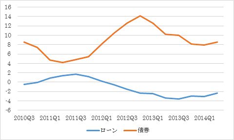 次に図2を見てみよう.図2によると,企業への銀行貸出は,2011年には一時プラスで推移したが,2012年に入ると再びマイナスに陥った.2013年第3四半期に-3.6%を記録して以降,やや改善傾向にあるものの,2014年第2四半期では-2.3%と依然マイナスが続いている.その一方で,債券による資金調達はプラスで推移し続けていることが分かる. このデータは大企業と中小企業を含めたものである.中小企業は資金調達を銀行に頼る一方で,大企業は証券市場にもアクセスできる.現在はローン金利よりも債券金利の方が低くなっているケースもあり,信用力の高い大企業は証券市場から資金を調達している.中小企業は,借入金利こそ下がっているものの,借入条件(担保を求められる,クレジットラインの設定を引き下げられる,借入要求額が一部減額されるなど)は改善していない.