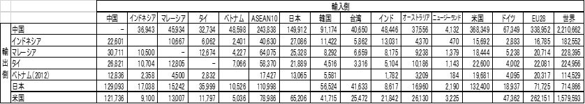 表2:中国・ASEAN及び日米の国・地域別輸出額(2013年、総額、100万ドル)