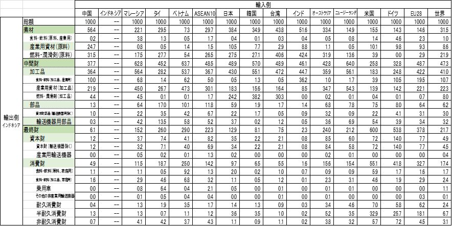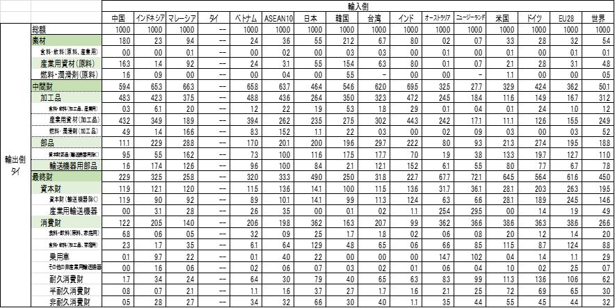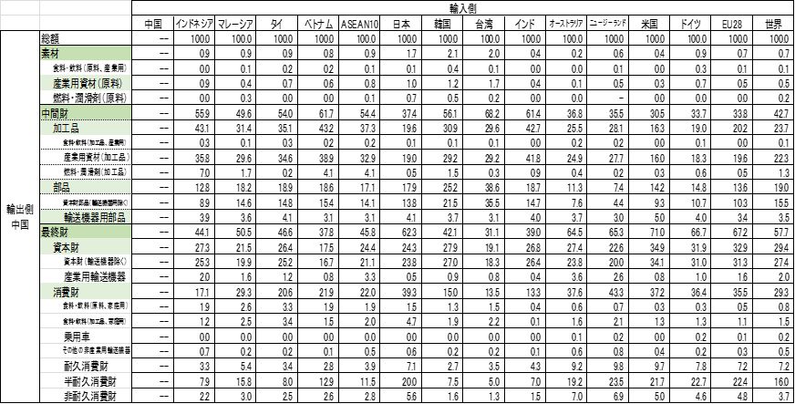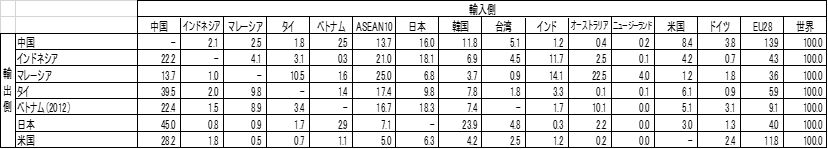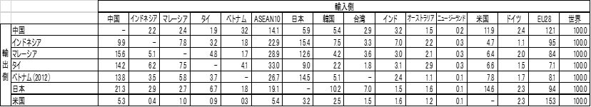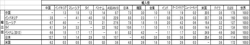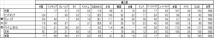 ② 中国の素材輸出の割合は1%未満、最終財輸出は58% 表7~表11は2013年の中国、インドネシア、タイ、ベトナム、日本の国・地域別輸出における財別構成比を計算したものである。 表7のように、中国の世界への財別輸出を見てみると、最終財の割合が6割弱、中間財が4割強であり、素材は1%にも満たないことが示されている。また、同表のように、中国の日・米・EUなどの先進国への輸出においては、最終財の割合が多いことが顕著である。 2013年の中国の日本向け輸出に占める最終財の割合は62%、米国向けは71%、EU向けは67.2%であった。中でもドイツ向けは66.7%であり、日本よりも割合が高い。このように、中国の最終財における日・米・EU向け輸出の割合が高いことから、中間財の輸出割合はいずれも30%台にとどまる。中国のインドや台湾向けの輸出では、最終財の割合は30%台と相対的に低い。 一方、中国のASEAN10への中間財の輸出割合が54.4%と高く、最終財は45.8%であった。中国の韓国向けや台湾向けの輸出では、中間財のシェアはASEANよりも高く、特に台湾向けは68.2%のシェアに達する。これにより、中国の台湾向けの最終財輸出の割合は3割台に低下する。つまり、中国の輸出においては、日米欧向けでは最終財中心、韓国・台湾・ASEAN向けでは中間財中心という傾向が見られる。 表8のように、2013年のインドネシアの財別輸出の特徴を見ると、中国向けの輸出に占める素材輸出の割合は56.4%にも達しており、ASEAN向けは29.7%である。インドネシアの対日輸出額に占める素材の割合は38.4%であり、韓国向けは34.9%、台湾向けは43.8%である。 2005年においては、インドネシアの中国への素材輸出の割合は32.3%であり、2013年よりも23%以上も低かった。また、ASEAN向けの素材輸出の割合は2005年で15%であったので、2013年よりも15%近くも低かった。2013年の日本向けの素材輸出では、2005年よりも12%もシェアが増加した。したがって、インドネシアの中国とASEAN、及び日本向けの素材輸出は、他の国よりも2005年以降に大きく拡大したことになる。 本稿では表は掲載していないが、2013年におけるマレーシアの中間財の輸出割合は高く、中国・ASEAN・日本向けは7割を超える。さらに、韓国向けの中間財輸出の割合は80.7%、台湾向けに至っては85.2%に達する。マレーシアの中間財におけるASEAN・日本・韓国・台湾向け輸出においては、加工品の割合が部品よりも圧倒的に高く、逆に米国、EU向け輸出では部品の割合が加工品よりも高い。 表9のように、タイの素材の輸出割合を見ると、世界全体では5.4%と少ないものの、中国向けが18%、韓国向けが21.2%となっている。また、タイの世界全体での中間財と最終財の輸出割合を比較してみると、中間財の割合が高いインドネシア、マレーシアと違い、中間財(2013年50.1%)と最終財(45%)の輸出割合にそれほど大きな差はない。 その中で、2013年のタイのASEAN向けと台湾向け、及びインド向けの中間財の輸出割合が高く6割を超える。タイの中国向けの中間財の割合は59.4%であり、日本向けは46.4%であった。タイの米国とEUへの中間財輸出の割合はそれぞれ32.9%と36.2%であるため、その分だけ両国・地域への最終財輸出の割合は6割を超える。 タイのインド向けの中間財輸出の割合が高い理由の1つとして、タイ・インド間のFTAを活用した貿易の影響が考えられる。自動車の部品などがFTAを利用してタイからインドへと輸出されているようだ。 タイの最終財の輸出割合は、中国向けが22.9%、ASEAN向けが33.3%、韓国向け25%、台湾向け31.8%と低い。これに対して、日本向けが49%であり、オーストラリア、ニュージーランド、米国、EU向けは6割を超える。 表10のように、ベトナムは中国と同様に最終財の輸出割合が高く、2012年においては57.1%であった。特に、米国向け輸出に占める最終財の割合は82.8%であり、EU向けは79.9%に達する。ベトナムの素材の輸出割合を見てみると、オーストラリア向けが54.7%と高く、マレーシア向けが34.1%、中国向けが30.2%、日本向けが24.2%、韓国向けが22.8%であった。 ベトナムの中間財の世界全体への輸出割合は2012年で27.7%であるが、ASEAN向けでは48.7%に達している。2005年におけるベトナムの中間財のASEANへの輸出割合は26.4%であったので、近年のベトナムへの外資参入の影響により、中間財の輸出割合が急速に上昇したことになる。これは、マレーシア、タイほどではないものの、ベトナムは加工品や部品などの中間財におけるASEAN域内のサプライチェーンに組み込まれつつあることを示唆している。また、ベトナムの米国やEU向けの中間財の輸出割合は1割強にすぎなく、日本向けでも35.3%である。 表11のように、2013年の日本の中間財の輸出割合は、中国、ASEAN、韓国、台湾、インド向けで高く、いずれも60%台後半か70%を超える水準である。これに対して、中間財の米国向けの輸出割合は44.4%、EU向けは52.7%にとどまる。 中間財の中でも、中国・ASEAN・インド向けは加工品と部品の割合が同じくらいであるが、韓国・台湾向けは素材よ