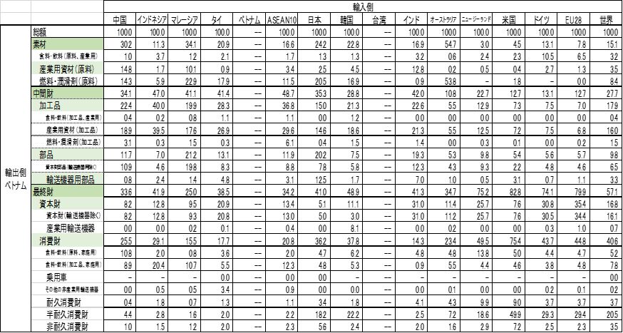 表10:ベトナムの国・地域別輸出の財別構成比(2012年、BEC分類、%)