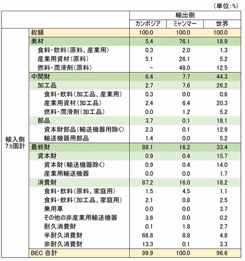 (5/6ページ) 2.ミャンマー・カンボジアの主要国との貿易の現状と特徴(1) 財別に見たミャンマー・カンボジアの輸出入動向 ① 逆推計で輸出入額を計算 東アジアの貿易構造を詳細に分析するには、素材、中間財、最終財などの需要段階別・用途別の分類でもって行うことが有効である。なぜならば、東アジア域内においては、ASEAN主要国は互いに中間財を中心とした貿易取引構造を形成しているため、こうした分類の方がより実態に近い貿易動向を説明できるからである。 ミャンマーとカンボジアに対する関心が高まっている中、中間財を中心にした中国・ASEAN域内でのサプライチェーンに両国がどう組み込まれているのかを探ることは、企業の東アジア戦略を考える上で重要なことであると考えられる。 そこで、本節では以下の表26~表29のように、ミャンマーとカンボジアの需要段階別・用途別の輸出入を、国連のBEC分類に基づき、中国、インドネシア、マレーシア、タイ、日本、米国、ドイツの7ヵ国の相手国側から逆推計により計算した。 なぜ逆推計を行ったかというと、現時点では、電子媒体によるミャンマーとカンボジアの貿易データを入手することができないため、同じ業種分類で両国を比較しようとすれば、相手国側から推計するしか方法がないからである。 また、ミャンマーやカンボジアの現地で公表されている貿易統計では、品目別の貿易額は主要品目別で分類されているが、需要段階別・用途別の分類では発表されていないためである。したがって、ミャンマーの国別財別の貿易構造を見るには、HSの8桁ベースの詳細な品目を発表している国より、ミャンマーとの輸出入を相手国側から得ることが必要になる。 つまり逆推計で求めた以下の表では、「ミャンマーの中国への輸出」は「中国のミャンマーからの輸入」から作成されている。このため、通常の輸出はFOB(本船甲板渡し条件; Free On Board)、輸入はCIF(運賃・保険料込み条件、Cost, Insurance and Freight)であるが、本稿の表26以降の表では、輸出がCIF、輸入がFOBで表されている。 この他にも、ミャンマー・カンボジアの輸出入額の逆推計は7ヵ国だけを対象にしている、輸出入額を計上する時点の違い、年と年度の違い、統計作成機関の違いなどのため、現地政府機関が公表した輸出入額と逆推計による輸出入額の合計は一致しない。 表26以降の表は、あくまでも、ミャンマー・カンボジアの貿易構造の分析を狙ったもので、貿易額の規模を把握しようとするものではない。つまり、シェアや年平均成長率の違いからミャンマーとカンボジアの輸出入構造がどうなっているのかを理解することが主眼となっている。すなわち、両国の素材、中間財、最終財という共通の需要段階別・用途別の業種分類で貿易動向を比較分析することで、貿易構造を的確に把握できることが、本稿での逆推計のメリットであると思われる。