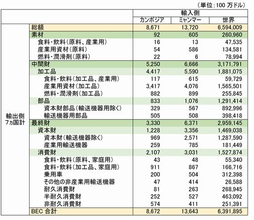 (注) 7ヵ国計は、中国、インドネシア、マレーシア、タイ、日本、米国、ドイツの合計(表29まで同様)。下欄のBEC合計と総額との違いは、貿易の元データを国連BEC分類に変換した時に、財別の重複や分類化できない等の理由で発生する。(以下の表、同様)