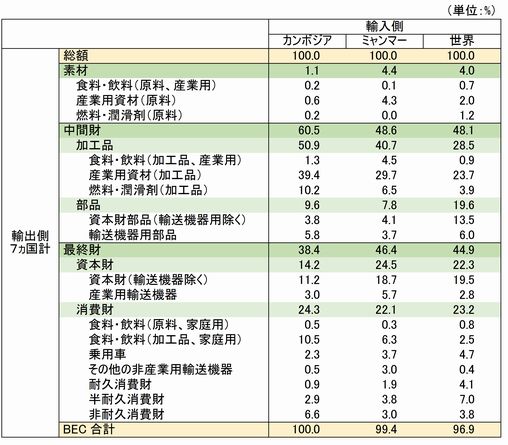 ③ 中間財のサプライチェーン網には組込まれてはいないミャンマー・カンボジア ミャンマーの7ヵ国からの輸入においては(表28、表29)、素材の割合が4.4%、中間財が48.6%、最終財が46.4%であった。中間財輸入のほとんどは産業用資材を中心とした加工品の40.7%であった。部品はわずかの7.8%にすぎない。最終財の輸入の内、資本財は24.5%、消費財は22.1%を占め、同じような割合であった。 カンボジアの輸入では、素材の割合は1.1%にすぎなく、中間財は60.5%、最終財は38.4%であった。ミャンマーと同様に、カンボジアでも中間財における加工品の比重が高く50.9%であった。部品は9.6%であった。最終財の輸入では、消費財の割合が高いが、これは食料・飲料(加工品・家庭用)のシェアが10.5%にも達していることが原因である。 ミャンマーとカンボジアの中間財の輸入割合がそれぞれ約5割と6割ということで、他のASEAN諸国と比較するとやや低いものの、それほど大きな差はない。ミャンマー・カンボジアは中国や他のASEANと同様に、中国・ASEAN域内から中間財を輸入する割合が高く、中間財の輸入では他のASEANと特に変わったことはない。