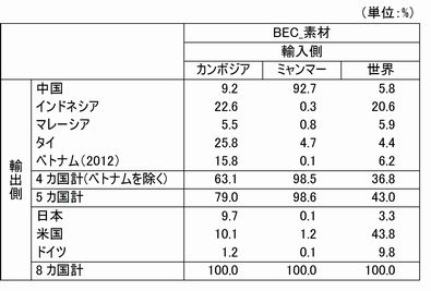 表33:ミャンマー・カンボジアの素材の国別輸入構成比(2013年、%)