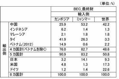 表37:カンボジアの7ヵ国とのBEC分類別輸出入動向(2013年、100万ドル、%)