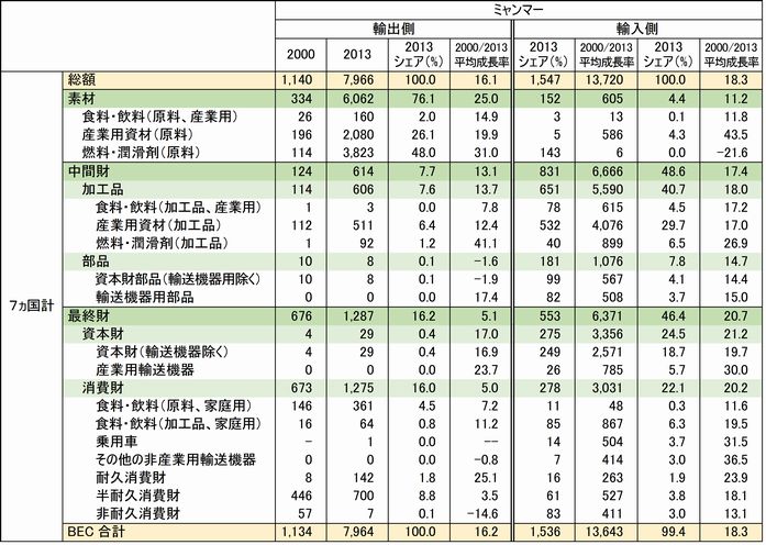 表36:ミャンマーの7ヵ国とのBEC分類別輸出入動向(2013年、100万ドル、%)