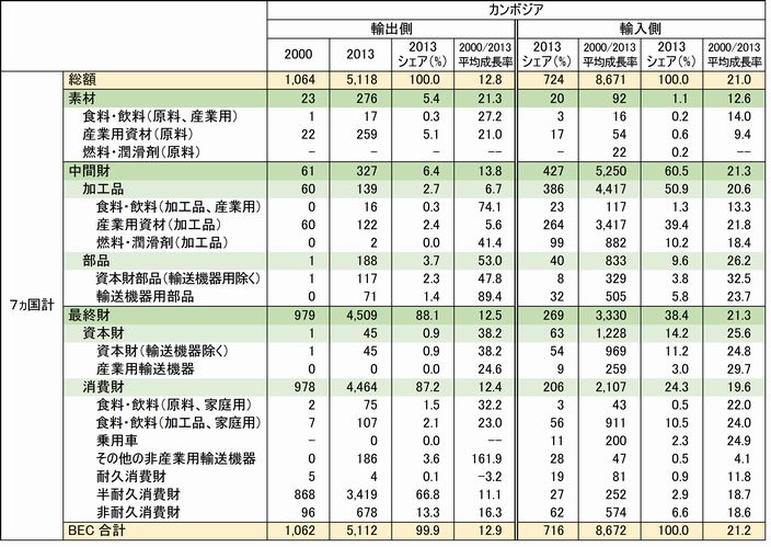 ③ 10~20%に達した2000年以降のミャンマー・カンボジア貿易の年平均成長率 表36と表37は、ミャンマーとカンボジアの7ヵ国(中国、インドネシア、マレーシア、タイ、日本、米国、ドイツ)との需要段階別・用途別分類による輸出入において、2000年~2013年までの金額・シェアとともに年平均成長率を求めたものである。 これによると、ミャンマーとカンボジアの7ヵ国との輸出入の年平均成長率が10%~20%に達しており、2000年以降の貿易の伸びが非常に高かったことが窺える。特にミャンマーの素材の輸出の年平均成長率は25%であるし、最終財の輸入は20.7%にも達している。 カンボジアの最終財(縫製品・履物)の輸出では伸びが一服しているが、二輪車などの非産業用輸送機器、輸送用機器・部品、資本財の年平均成長率が高い。カンボジアの輸入では、中間財、最終財とも20%を超える年平均成長率を示している。 このミャンマーとカンボジアの2000年以降の輸出入の年平均成長率の高さは、両国の経済発展の勢いをそのまま表しているものと思われる。ミャンマーとカンボジアの輸出入の年平均成長率は、いずれも他のASEANを上回っている。 ミャンマーとカンボジアは、2015年からACFTA/AFTAの関税率を引き下げる。これを契機に、徐々にモノカルチャー的な貿易構造から脱却し、多くの品目を取り扱う多層的な貿易形態に移っていくことが期待される。 そして、現在のミャンマーの素材中心、カンボジアの最終財(繊維・履物)中心の輸出から、もう少し中間財のシェアを高めた構造に転換するようになれば、ミャンマー・カンボジアにおける輸出入はさらなる持続的な成長が見込まれる。
