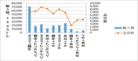 目次3.ACFTAやAFTAを利用できる品目の割合は7割~8割台 4.日本が中国とのGSPを利用できない品目数は7割強相当の6,500品目 5.関税率差が20%以上もある品目でFTAを利用できる割合が高いタイ 3.ACFTAやAFTAを利用できる品目の割合は7割~8割台表2や表3では、FTAの利用率の計算において、分母にFTAを利用可能な品目の輸入額を用いた。FTAを利用可能な品目とは、関税率差(MFN税率-FTA税率)がある品目のことを指す。関税率差があれば、FTAの関税削減の利益を享受できるわけであるから、FTAを利用できる品目となる。もしも、関税率差が0であれば、FTA利用による何の利益も発生しないので、FTAを利用できない(FTAのメリットがない)品目となる。 図1は輸出入国別のFTAを利用できる品目数と輸入額を描いたものである。ここでの輸出入国とは、中国のASEANからの輸入、インドネシアの中国・ASEAN・日本からの輸入、タイの中国・ASEAN・日本からの輸入、日本の中国・ASEAN・タイからの輸入、の10通りの組み合わせを指している。図1はこの10通りの輸出入国別に、FTAを利用できる(関税率差がある)品目数と輸入額を計算した結果を描いている。そして、図2は、輸入額と品目数の割合を求めたものである。