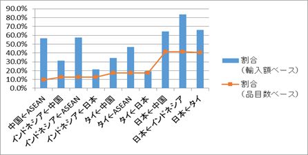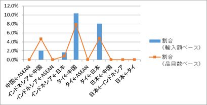 逆転現象が起きているのは10の輸出入のケースにおいて、4ケースしかないわけであるが、その品目数はタイの中国からの輸入では760品目、インドネシアの中国からの輸入では462品目、タイの日本からの輸入では459品目に達している。 ACFTAを活用した中国のASEANからの輸入や、EPA/GSPを活用した日本の中国、インドネシア、タイからの輸入では、逆転現象は生じていない。