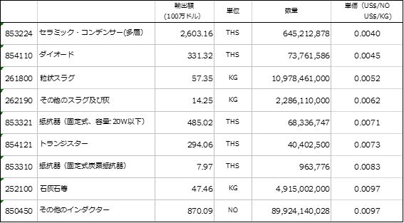 次回は、平均輸出単価を1ドル未満の輸出商品を取り上げる |