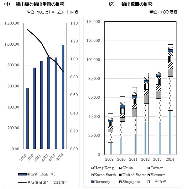 注 数量単位が1000個(TH)の場合は、単価は1個あたりに換算している。 2. HS85.04.50:(その他のインダクター)HS85.04.50に分類する商品は、インダクター(トランスフォーマーとスタチックコンバータ及び陰極線管用の偏向コイルを除く)である。 2009年当時の平均輸出単価は1.33セント/個であったが、単価の下落が続き2013年には1セントを下回っている(図-1)。2014年に単価は0.86セント/個に下落したものの、数量は最高の1,000億個を超え前年比28.9%増の約1,159億個である。輸出額も10億ドルに近い(9億9355万ドル)。 輸出量は2009年が435億個だったのが、5年後の2014年には2.7倍増になっている。 輸出先は中国(および香港)が上位を占め、数量(約821億個)で70%を超える。次いで台湾、韓国、米国、ベトナムと続き、上位6か国・地域で輸出量の93.4%を占めている。 一方、輸出額では中国(および香港)向けは輸出額の62.2%を占めている。輸出額が1,000万ドルを超える12か国のうち、米国(3位)、ドイツ(6位)、オランダ(11位)以外は東アジア向けである。 なお、東アジア向け輸出は輸出額で84.4%、 輸出量で91.9%と圧倒的である。