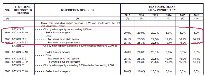 2013年以降のJIEPA税率については、2012年のインドネシア財務大臣規定第209号(209/PMK.011/2012)に記載されている。この規定によれば、譲許表の「P13」に該当するセダン及びステーションワゴンのJIEPA税率は、合意通りに2016年に5%に引き下げられる予定である。一方、表2に記載の無かったセダン及びステーションワゴン以外の乗用車は、税率が記載されているものの、2013年に税率28.1%、2014年に25.3%と協定の「P14」とは全く異なっている。 実はこの税率はJIEPA協定の「B15」(協定の発効から15年、16回の段階的引き下げによる撤廃)が適用された税率であり、「P14」では税率が5%に引き下げられるのは2016年となっていたが、「B15」では2021年に5.6%と関税の削減は大幅に遅れることになる。