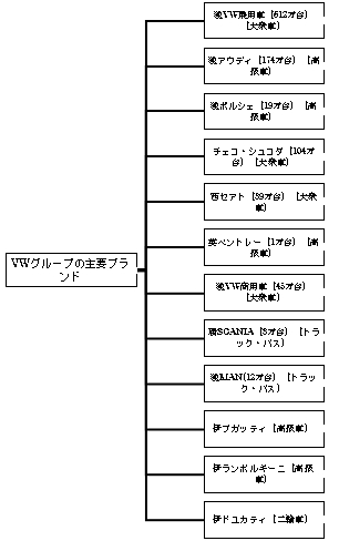 2005年当時、世界販売台数519万台だったが、企業の合併・買収(M&A)を積極活用する手法で10年間に倍増することに成功した。現在VWグループは、12ブランドの企業群で構成されている(図2)。 1937年5月、VWの前身、ドイツ国民車発起有限会社が設立された。ライバル企業トヨタが設立された時期も1937年8月で偶然の一致である。翌年VWという名称となった。1965年に独アウディ(Audi)の前身、オートユニオン(Auto Union), 1985年にスペインのセアト(SEAT), 1991年にチェコのシュコダ(ŠKODA)、1998年に英国のベントレー(Bentley),イタリアのランボルギーニ(Lamborghini), 伊ブガッティ(Bugatti), 2012年に伊二輪車メーカー、ドュカッティ(Ducati)、ポルシェ(Porsche)をそれぞれ子会社化していった。他方、商用部門(トラック・バスなど)では、2008年にスウェーデンのスカニア(Scania)、 2011年に独MANを子会社化した(注4)。
