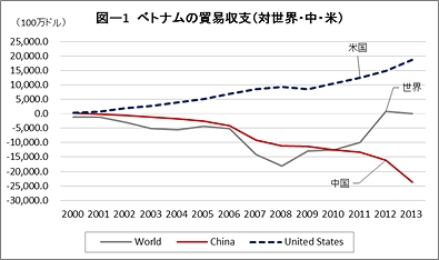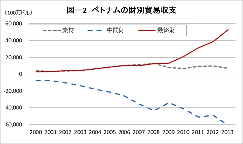 ベトナムのこの動きをみると、かつて中国で起きた光景が浮かんでくる。中国では、IT部門の貿易収支が黒字基調に転じたのが2002年以降である。2002年に30億ドルの黒字を計上した後、2008年には黒字幅が1000億ドルを超えた。中国がIT貿易で大幅黒字を計上するようになった背景には、2001年12月のWTO加盟を契機として外資系企業の中国生産が加速したことが挙げられる。2001年には、中国の全輸出に占める外資系企業のシェアは2001年に50.1%となり、初めて過半を占めた。輸出品に占める外資系のシェアを品目別に見ると、外資系のシェアが特に高いのはコンピュータ製品であった。 2001年において輸出額が最大の外資系企業は、台湾系のFoxconn(富士康科技集団))、次にモトローラ中国電子、長城国際信息産品(IBM)、北京ノキア、東莞ノキアと欧米勢が続いていた。また、Foxconnに代表される台湾系EMS企業が中国のコンピュータ輸出を大きく拡大させた。台湾政府はノートPCの中国生産を国内産業の空洞化懸念を理由に認めていなかったが、2001年11月に解禁したことで、台湾のEMS企業が中国生産を加速させて、中国のIT輸出拡大の促進要因となった。 ベトナムでも中国と同様に外資系のITセットメーカーがベトナムを世界市場に供給するグローバル拠点として位置付け始めた。いち早く、グローバル拠点として位置付けてベトナムで量産体制を構築した企業は、キヤノンである。キヤノンは、プリンターの生産をメキシコからハノイに移管して2002年に工場を立ち上げた。今では、ハノイ市に1工場、同市に隣接するバクニン省クエボ工業団地に2工場等を持ち、インクジェットプリンター、レーザープリンター、スキャナー等を世界市場に輸出している(キヤノンの全世界生産量の3割を、ベトナムの3工場が担っている)。しかし、キヤノンに続くような企業は出てこなかった。 変化が起きたのは、2009年にサムスン電子が、北部バクニン省で携帯電話の工場建設を発表し2010年に稼働したことからである。2014年3月には、北部タイグエン省でスマートフォンの生産を開始し、同年11月には、新携帯電話工場の建設を目的とした、30億ドルの追加出資の認可を同省より取得した。サムスンの携帯電話生産の半分はベトナムで生産されているという。また、サムスンディスプレーがバクニン省でスマートフォン用ディスプレー工場建設(10億ドル)の認可を取得している。 サムスンは、ホーチミンでも市内にあるサイゴンハイテクパークでテレビ、エアコン、洗濯機などの家電生産を始めることになっている。2014年のベトナムの投資受入れでは、サムスン電子が飛びぬけて大きい。2014年の新規投資額の上位10案件をみると、韓国、香港、シンガポールの案件が合計で8件となっているが、サムスングループによる投資額が1位、2位、4位となり、合計で54億ドルと新規投資額全体の32.7%を占めている。地域別にみると、北部が6件、南部が3件、中部が1件となった(注1)。サムスン以外では、LGが家電生産を開始、マイクロソフトはノキアから取得した携帯電話工場を2014年5月に、中国、ハンガリー、メキシコから2015年2月までにベトナム工場に集約することを発表(中国とハンガリーの工場は閉鎖、メキシコの工場は修理工場に変更)している(注2)。 こうした外資系ITセットメーカーによる量産工場の開設が相次いだことで、ベトナムは一躍IT製品の輸出国に躍り出た。 中間財貿易の赤字幅は拡大貿易収支が黒字基調に転じている一方で、対中貿易収支は赤字幅が年々拡大している(図―1)。対中輸入が大きく増加しているためである。中国からの輸入は堅調に増加基調にある。中国からの輸入品は、インフラ整備やビル建設用に使われる機械設備・同部品と鉄・鉄くず、織布・生地、電子部品、二輪部品、繊維、履物、プラスチック、果物、日用品、生産原料等多岐にわたり、ベトナムの産業にとって中国からの輸入は不可欠といえる。 図―2は、ベトナムの財別貿易収支である。最終財の貿易黒字が拡大している一方で、中間財の貿易赤字は、一層、拡大している。2013年の中間財の貿易赤字幅は609億ドルに達し、この中間財貿易赤字の約4割弱の224億ドルが中国との貿易によるものである。