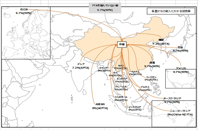 図 中国のマシニングセンター(HS845710)のFTA利用による関税率の変化(単位:%)