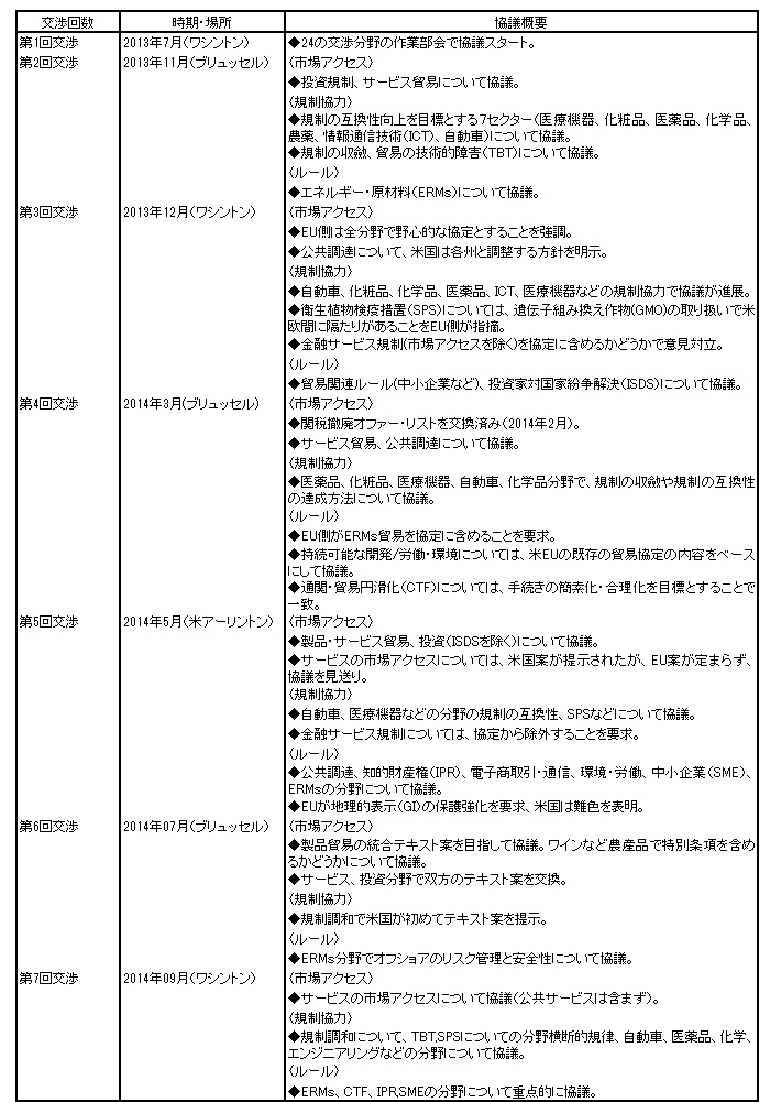 <第1期:2013年~2014年> 第1期の交渉の推移と協議内容は、表2のとおりである。当期のEU側のTTIP交渉代表はデ・ヒュヒト通商担当委員(閣僚)、米国側はフロマン米通商代表部(USTR)代表が務めていて、合計7回の交渉が開催されている。 第1回交渉が2013年7月、ワシントンで開催されたが、約150人の交渉代表が24の交渉分野の作業部会に分かれて協議をスタートした。2013年10月に予定されていた第2回交渉は米国の2014年度暫定予算の不成立による一部の政府機関の閉鎖の影響で2013年11月に延期されたものの、第3回交渉は予定通り、2013年12月にワシントンで開催された。 2014年2月の交渉進捗を確認する会合(Stocktaking Meeting)で、2014年中に5回の交渉を行うという欧州委員会代表のデ・ヒュフト通商担当委員(当時)と米通商代表部(USTR)のフロマン代表が確認したにもかかわらず、結局、4回の交渉開催に止まった。 その一因は、欧州委員会執行部の任期満了にともなう交代人事案件がある。欧州委員会は2014年11月、ユンケル委員長の下で新たな体制でスタートした。その際、通商担当委員も前任のデ・ヒュフト委員から新任のマルムストロム委員に交代した。他方、米国側の方も2014年11月に、米議会の中間選挙があったことも交渉の進行を遅らせたと考えられる。なお、欧州委員会は2014年9月の第7回交渉から協議内容に関する報告書を公表している。