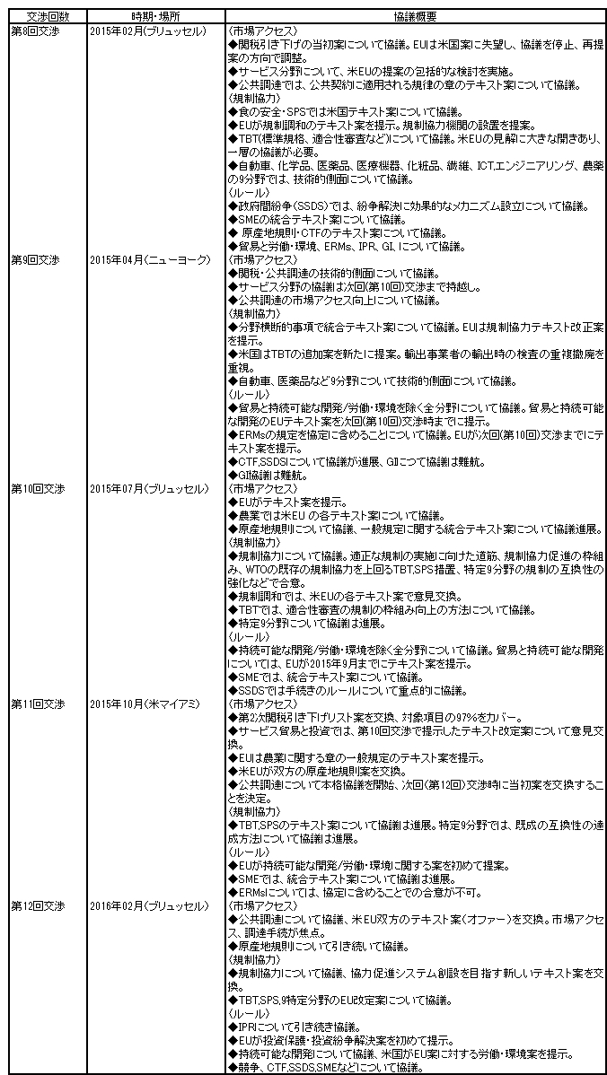 5) ,European Commission(Directorate-General for Trade) Press release, Memorandum, News archives、Public Report of the TTIP Round of Negotiationsなどの資料の他に、ジェトロ(2016)「EU米国間の包括的貿易投資協定(TTIP)に関わる交渉進捗状況と欧米産業界の見方」(2016年3月)、ジェトロ(2015)「EU米国間の包括的貿易投資協定(TTIP)交渉の進捗状況(2014年3月~2015年3月)」(2015年4月)、ジェトロ(2014)「EU米国間の包括的貿易投資協定(TTIP)の交渉の進捗状況」(2014年4月)(以上いずれも、編集はジェトロ・ブリュッセル事務所、海外調査部欧州ロシアCIS課)に多くを負っている。