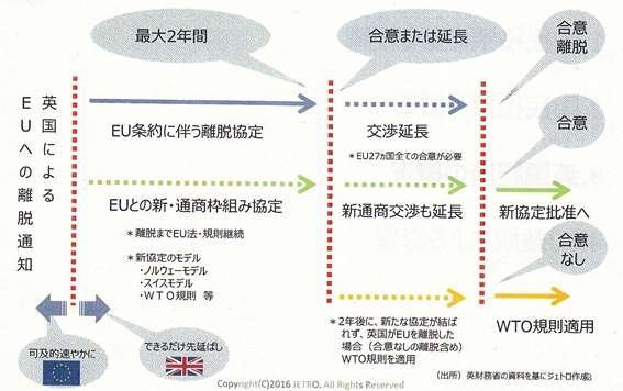 (出所) ジェトロ・セミナー「英国のEU離脱と日本企業への影響」(2016/07/29):資料「英国のEU離脱と日本企業への影響」、13ページ。 ① 離脱手続きと新協定締結を2年以内に同時に行うケース