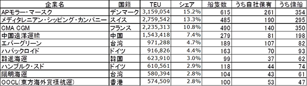 世界10指に入る韓国の韓進海運が8月31日に法定管理(日本の会社更生法に相当)を申請したが、事前に影響を最小化する方策がとられなかったため、世界中で混乱が生じている。韓国の海事当局によると、9月5日までに韓進海運が運航するコンテナ船61隻、バラ積み船18隻が、入港料の現金での支払いを要求され、事実上入港を拒否された。停泊中の船についても差し押さえの対象となったり荷役の現金払いを要求されて運航が停まっている。日本近海でも、名古屋や横浜などへの入港を拒否された韓進海運の複数の船が沖待ちしており、韓国の労働組合からは韓国政府に乗組員の保護を求める要望が出されている。 規定路線だった債権銀行団による法定管理への追い込みコンテナ貨物の輸送料の目安となるChina Containerized Freight Index(1998年1月1日=1,000とする中国発の米国東海岸、米国西海岸、欧州向けの運賃指数)は、2014年下半期から2016年6月まで下落傾向にあり、いずれも2016年8月時点で1,000を下回っている。特に米国西海岸向けは400前後にある。 長引く海運不況で、韓国の二大海運会社である現代商船と韓進海運は、2016年3月と4月に相次いで債権銀行団の管理下に入った。現代商船の負債額は4兆8,000億ウォン(1ウォン=0.09円)、韓進海運の負債額は6兆6,400億ウォンに膨らんでいた。両社に共通しているのは、創業家出身の会長の死去に伴い、経営経験がない未亡人が会長職を継いだという点があげられる。素人経営が他の海運会社に比べて傷を広げた理由という厳しい指摘もある。 世界を一周する国際航路の維持には莫大な経費がかかる。大手海運会社はアライアンスを組んで船舶を運航し、同じアライアンスが受けた積荷を融通している。現在は4つのアライアンスがあり、現代商船は日本郵船や商船三井と同じG6アライアンスに、韓進海運は川崎汽船と同じCKYHEアライアンスに属す。アライアンスは海運不況などをきっかけに不定期に組み替えられる。2017年には4つのアライアンスを3つに再編する予定で、経営難の2社が加盟できるか憂慮されていた。 表1 10大コンテナ船運航会社とコンテナ輸送能力