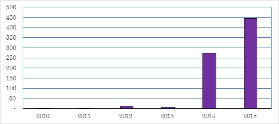 1. 最も伸び率が高かった「蓄電池部品」米国が日本から輸入している商品のうち、「蓄電池の部分品・付属品(鉛蓄電池を除く、以下「蓄電池部品」)が過去5年間の金額の伸びが最も大きかった。2015年の輸入額は、2010年に比べ38.2倍増で、2015年の対日輸入額が1億ドルを超える191品目中(米国輸入統計HTS10桁分類レベル)最大である。 HTSでは「蓄電池部品」を85.07.90-8000に分類する。「蓄電池部品」の日本からの輸入は、2013年以前までは数百万ドルから1,000万ドル台に留まっていた。ところが、2014年に2億7,248万ドル、2015年に4億4,405億ドルに達している(図-1 参照)。なお、日本の輸出統計分類では鉛蓄電池用の部品を含み、鉛蓄電池用の部品を除いた「蓄電池部品」の輸出額は明らかではない。