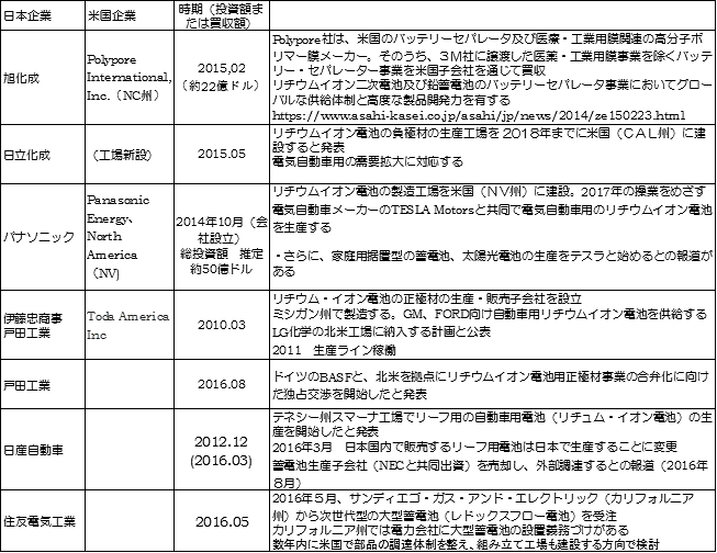 表-1 米国における日系企業の蓄電池関連事業(対米投資)の例