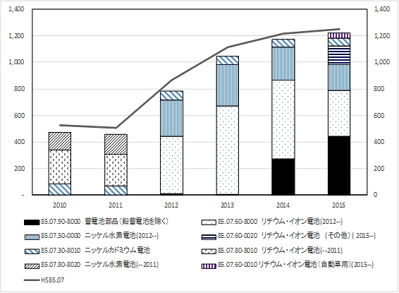 注 HTS85.07項の細目の分類は、2012年、2015年に改定があり、統計番号が不連続になっている。リチウム・イオン電池とニッケル水素電池は85.07.80に分類されていた。2012年のHS改定でそれぞれ8507.60.85.07.80に分かれている。また、ニッケル・カドミウム電池は電子機器の電源などに幅広く普及したものの、電極に有害物質のカドミウムを含むことから使用されなくなり、電極にカドミウムを含まない後発のニッケル水素電池に置き換えが進んだ。このような貿易の変化がHTS分類番号改定に反映されている 出所 米国輸入統計より作成