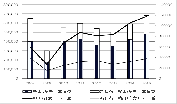 2015年の日本企業によるロボットの総出荷台数は155,521台。そのうち、輸出は117,818台と過去最高を記録した。輸出台数だけでなく、受注台数(155,086台)、生産台数(153,785台)、国内出荷台数(37,703台)も2009年以降最高だった。輸出数量の増加は著しく、2015年の輸出量は出荷台数の75.8%に相当する。また輸出額は出荷額の70.6%相当する規模だった(日本ロボット工業会の統計、図―2)。 輸出が好調な要因は、国内での旺盛な需要増に加え海外需要の拡大である。特に米国の景気拡大と製造業回帰による産業用ロボットの堅調に伸びていること、減速気味の中国でも自動化投資意欲が高いこと等を日本ロボット工業会は指摘している。 図-2 日本の産業用ロボットの輸出等の推移 単位: 100万円(左目盛)、台数(右目盛)