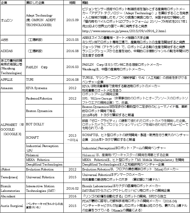 2. 活発な米国におけるロボット関連企業の買収・出資米国向け日本製産業用ロボットの輸出が高水準にある背景は、ロボットの需要増加に加え、米国内でのロボット分野への関心の高まりである。特に、IT大手企業やベンチャー企業等による積極的な投資やロボット企業の買収等が目立つ(表―1)。近年のロボット分野の投資の主な特徴をあげると次のとおりである。 第1は、M&Aの増加。ロボット関連企業のM&A案件数は2011年の5件から2015年の15件に増えている。特に、米国IT企業によるロボット企業~人工知能やロボット関連基礎技術のベンチャー開発企業の買収が多い。 例えば、2013年12月から2014年1月の2カ月間で、GOOGLEの未来志向の開発グループ(GOOGLE X)がロボット関連企業を7社買収した。ただし、同社は買収した歩行型ロボットの開発企業のBoston DynamicsおよびSCHAFTの2社を手放しトヨタに売却する方向と報道されるなど、米国企業は自社の狙い・方向性に合わないと判断すると手放す判断が早い。 また、オムロンはAdept Technology社を買収するなど、外国企業による国境を越えたクロスボーダーM&Aが目立つ。この傾向は米国内だけでなく欧州でも強まっている。例えば、美的集団はドイツのロボット大手企業のKUKA社に対するTOBを実施し買収・完全子会社化する。ただし、中国企業におけるロボット関連技術企業の買収には、軍事面での応用や最新技術の流出への懸念から警戒感が根強くある。 第2は、ロボット分野のベンチャー企業への投資拡大。IT関連企業ばかりでなく、ベンチャー・キャピタルからの投資が増えている。2015年のロボット分野のベンチャー企業への投資額は約9億2,270万ドル(43件)で、前年(3億4,130万ドル)の約2.7倍、2011年(1億9,360万ドル)の5倍近い規模で、4年連続の増加となった(Hizook調査)。また、既存企業からスピンアウトして新たな分野でのロボット開発をする企業も少なくない。 第3は、米国内での産業用ロボットの生産強化の動き。製造業の回帰とも関連し、産業用ロボットの生産を強化する。例えば、スイスのABB社は同業他社に先駆け米国でロボットの現地生産に踏み切るのは、製造業回帰の動きをふまえ高い需要が期待できるためであろう。 また、製造業の回帰の背景にある人手を極力使わない動きは、さまざまな分野でのロボット導入を加速させている。例えば、物流倉庫などでの搬送用ロボットの導入が進み、物流部門はロボットが活躍しコストダウンにつながる分野とみなされている。例えば、Amazon.comは倉庫ロボットメーカーのKIVA Systemsを買収し(2012年)、同社だけでも3万台を超える倉庫ロボットを使用し物流倉庫のオートメーション化を進めている。このため、物流業界全体でもロボット開発競争が激しくなっている。第4は、ロボットによる自動生産の動き。米国の製造業回帰のためには、ロボットを活用した人手を極力使わらないオートメーション化が必須である。例えば、スポーツ用品のADIDAS社は、米国にロボットによる靴の生産を開始すると発表した。スピードファクトリー(Speed Factory)と呼ぶ工場建設はドイツに次いで2工場目。ランニングシューズから生産を始め、中期的には複数ジャンルの靴を年間50万足生産する方針である。NIKEも同調する方向にある。 3. ITに特化した米国IT大手企業の研究開発欧米におけるインダストリー4.0 、“IoT”(Internet of Things)、“MtoM”(“M2M”、Machine to Machine) を通じたロボットへの関心の高まりも大きい。 米国ではベンチャー企業によるロボット開発に加え、大手IT企業を中心にした『AI(人工知能)やITに特化した研究やシステムの開発』に重点がある。ドイツが製造技術の高度化・標準化を目指すのに対し、米国はITビジネスをリードしてきた大手IT企業がロボット関連分野に参入している。M&Aでロボット技術の物流倉庫用のロボット技術や最先端技術開発を進めるベンチャー開発企業を傘下に収める一方、ロボットを『データ端末』としてとらえビッグデータの収集と活用を組み込んだシステム開発を重視している点に欧州や日本の目指す方向の違いに特徴がある。 例えば、“無人運転車”(ロボットカー)の開発に必要なのは、クルマを制御する技術やセンサー機能などの「安全性の保障」だけではない。「認識・判断能力の安定」が必須要件で、クルマを動かすためのシステムやデータの研究が欠かせない。IBMは『WATSON』を使い、人間の音声を認識させ応答する人口知能の開発に取り組んでいる。 GOOGLEなどは道路・地図情報(『Google Map』)をビックデータとして蓄積している、など。 4. 日本のロボット新戦略日本の産業用ロボット輸出増加が見込まれる。さらに、生産現場だけでなくロボットの活躍する分野が広がり、さまざまな場所で使われることが広まることは確実である。このため、日本の企業はロボットの開発や生産を強化、拡充している。 日本のロボット開発の特徴は、ロボットそのものの開発に重点があるかのようにみえる。なかでも、日本が開発をすすめている