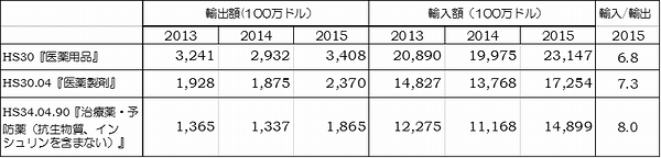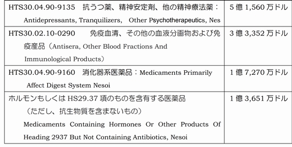 米国が日本から輸入している医薬用品(HS30類)の輸入額は15億7,006万ドル。そのうち、医薬製剤(HS30.04項)の11億8,827万ドルと、血液製剤(HS30.02)の3億4,387万ドルの2分野で9割を超える。日本からの輸入額が1億ドルを超える医薬品(HTS10桁レベル)は下表(表-1)の4品目である。 なお、日本の輸出統計によるHS30.04項(医療製剤)の輸出額(23億7,029万ドル)のうち、対米輸出額(9億6,593万ドル)は全体の40.8%を占め、米国は最大の輸出先である(2015年実績)。