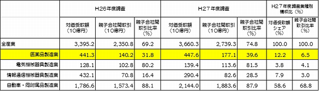 2. 抗うつ(鬱)薬の使用者が、人口の1割。3千万人を超える米国抗うつ剤の対米輸出が増えている要因に、3,000万人を超えるといわれるほど抗うつ薬の使用者が多いことがある。 米国CDC(疾病対策センター)は、抗うつ薬の使用状況(2005-2008年)をまとめている。 特に、40代、50代の女性は23%と高い。これは男女別年齢階層別で最も高い。 また、前回の調査(1988–1994年)に比べ、12歳以上の服用者は4倍に増えている。Journal of the American Medical Association (JAMA)によると、1999年から2012年の間で抗うつ薬の使用者の割合は6.8%から13%へとほぼ倍増している。 抗うつ薬の服用者が増加しているのは米国だけではない。OECDの調査によると過去4年間にドイツは46%増、スペイン、ポルトガルの20%増など、米国以外でも服用者が増えている。こうしたことが、抗うつ剤の輸出増加の背景とみてよい。 3. 海外で稼ぐ日本の医薬品製造業日本の医薬品輸出は今後増えることが期待されている。しかし、諸外国の患者に使われる医薬品(創薬)を開発しても、日本で生産し輸出が主体になるとは限らない。日本の製薬企業は、商品輸出に頼らず海外から特許料等の知的財産使用料で稼ぐビジネスモデルを採っている。 日本の医薬品貿易収支は輸入超過である(表-2)。輸入額は輸出額の約7倍前後と大きい。 ところが、総務省の科学技術研究調査から、日本の製薬企業は特許等の知的財産権の使用料で稼いでいる状況がわかる(表-3)。 日本の技術貿易輸出額(受取額)は自動車・同付属品製造業(以下「自動車製造業」)が最大である。全業種の受取額の5割以上を占めるが、受取額の約9割が海外子会社からのライセンス収入である。一方、医薬品製造業は日本企業の受取総額の約12%台を占めるにとどまるが、自動車製造業に次ぐ規模である。自動車製造業と大きく異なるのは、海外子会社からの受取額が4割以下で、大半を親子会社関係にない外国企業から受けとる『外販』収入である。その結果、親子会社間取引を除いた受取額(『外販収入』)でみると、医薬品製造業は自動車製造業を上回り、最大業種である。 このことから、日本の製薬企業は医薬品を製造・輸出するだけでなく、海外子会社(買収して子会社化したものを含む)の工場での生産または海外の医薬品の生産を請け負う外国企業に委託し生産したものを、外国で販売する。あるいは、世界大で販売できる大手医薬品メーカーに特許権の製造・販売するライセンスを認めライセンス収入で稼ぐビジネスモデルを採っている。その結果が「知的財産権使用料」の受取として利益を得る結果に表れている。 医薬品(創薬)は、特許等の知的財産権で保護されている。特許権は原則として一つの物質特許で、その保護期間中は独占的な利益を得ることができる。ライバル企業が効能等で競合する新薬が発売されないうちに、研究開発投資を含めた利益回収が必須になる。そのため、短期間に世界中で製造・販売するために他社にライセンス使用を認め、知的財産権収入(ライセンス収入)得ることも、有力な手段になっている。 こうしたことから、外国での医薬品販売のために日本で製造・輸出する選択を選ぶかどうかは。日本での生産が有利であるのか販路をどう確保するのかによって決まる。おそらく、日本の需要には国内生産、米国などの主要大消費地向けは現地生産をとりいれる一方、製造・販売ライセンスを供与する方策を活用する、等の多様な手段を採る。そのため、日本の輸出が増えても、輸出だけに依存するのではなく「知的財産権使用料」の獲得を活かす取組みが続く可能性が高い。
