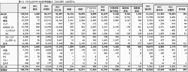 ベトナムの最終財輸入額425億ドルの内、対RCEPが313億ドル、対TPPは100億ドルとRCEPがTPPを圧倒している。ベトナムの主な最終財輸入国・地域は、中国、ASEAN(タイが最大)、EU、韓国、日本であるが、中国とASEANでほぼ半分を占めている。