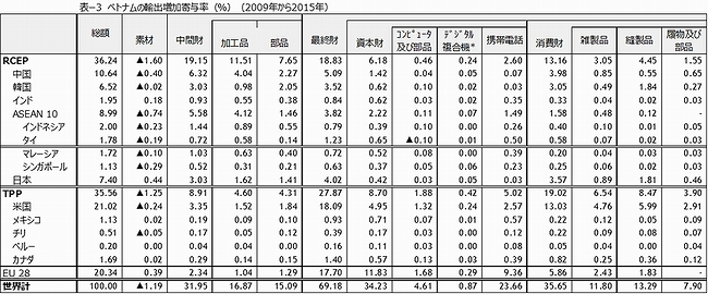 ベトナムにとって対米輸出は、対EU輸出と並ぶ輸出拡大の牽引力である。2009年から2015年間におけるベトナムの輸出拡大に対する米国の増加寄与率は21.0%、EUが20.3%、中国は10.6%と欧米向け輸出が牽引力となっている。特に、雑製品やアパレルの輸出では、対米輸出寄与度が大きい。