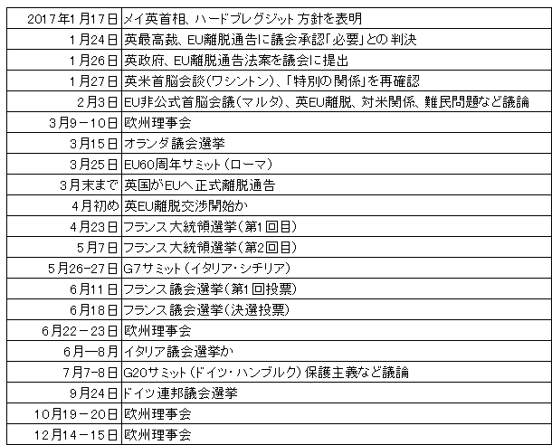 メルケル独首相の指導力に陰り英国のEU離脱(ブレグジット)の決定、米国のドナルド・トランプ政権の誕生の激震の余波は、年間を通して、欧州の政治・経済を大きく揺さぶることが予想される。欧州は、フランスの大統領選挙、ドイツの連邦議会選挙など重要な政治イベントを控えて、「政治の季節」に入る(表1)。