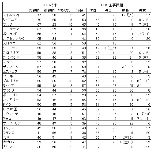主要メディアは、世論調査に基づいて、ルペン氏が第1回投票で首位に立つものの、2回目の決選投票ではフィヨン氏に敗退し大統領の座には届かないとみていた。しかし、最有力視されていたフィヨン氏が親族の公金横領疑惑のスキャンダルで、求心力を大きく失ってしまった。直近の世論調査(2月16 日)では、トップはルペン氏25~26%、第2位はマクロン氏20~23%、第3位フィヨン氏17.5~18.5%、第4位アモン氏14~14.5%、第5位メランション氏11.5~12%となっている。 ルペン党首は、「フランス第一」を前面に押し出し、有権者の治安や難民への不満の高まりを踏まえ、「(域内の自由移動を保障する)シェンゲン協定離脱」「移民の受け入れ制限」「不法移民の送還」「ユーロ離脱」など144項目に上る選挙公約を発表、第1回投票に向けて先行している。 新たな動きとして、左派系の社会党アモン氏と左翼党メランション氏が決選投票に進むために共闘する可能性が出てきたことで、新たな波乱要因となっている(注4)。 いまのところ、第2回の決選投票ではマクロン氏が62%を得票し、38%のルペン氏を、あるいは57%得票のフィヨン氏が43%のルペン氏を、いずれの場合でも破る見通しであるが、マクロン氏はまだ、選挙公約を明らかにしていない(注5)。 英EU離脱の国民投票や米大統領選挙の欧米メディアの世論調査の予測は、ことごとく外れてしまったことは周知のとおりである。フィヨン氏あるいはマクロン氏が党派を超えた幅広い支持を集められない限り、勢いづくルペン氏が決選投票で勝利する可能性も排除できない。極右の大統領の誕生は、フランスのみならず欧州、延いては世界を不安定化させ、EU分裂の危機を現実化させよう(注6)。 独SPD首相候補シュルツ、支持率でメルケルをリード長い間、沈黙を守っていたメルケル首相は昨年11月、連邦議会選挙に首相候補として出馬して、4期目を目指すことを明らかにした。メルケル氏は2005年に首相に就任、すでに、3期目に入っている。もし、4期目の2021年まで在職すれば、キリスト教民主同盟(CDU)のヘルムート・コール元首相と同じ最長在任を記録することになる。 しかしながら、シリアなどからの難民の受け入れを歓迎すると表明し、欧州の難民問題を深刻化させたとして、ドイツ国内のみならず、他のEU諸国から強い批判を浴びた。トランプ氏も大領領選挙期間中に対立候補のヒラリー・クリントン氏を「米国のメルケル」と呼び、数十万人の難民を受け入れたメルケル氏の決断を「正気ではない」と断じた。 メルケル氏自身が党首を務めるCDUは、難民の受け入れに反対する「ドイツのための選択肢」(AfD)に、バーデン・ヴュルテンブルグ、ラインラント・プファルツ、ザクセン・アンハルトなどの州議会選挙で敗れるなど地方選挙で苦戦し、4期目を目指すかどうか注目されていた。2015年には中東・アフリカなどから100万人を超える難民がドイツに殺到し、寛容な難民政策を掲げるメルケル氏に批判が集まり、支持率は大幅に低下し、同氏のリーダーシップに陰りが出ている。 それだけに、AfDなどポピュリズムが急速に勢力を増しているなか、メルケル氏は「今秋の選挙は、1990年のドイツ統一後以降で、最も厳しいものになる」と語っている。欧州で最も経験豊かな指導者といえどもメルケル氏の再選は盤石ではない。 このところ、メルケル首相支持率が、対立候補のSPDシュルツ氏を下回っている。直近の世論調査(公共放送ARD、2月2日)によると、シュルツ氏50%に対して、メルケル氏34%にとどまった。ただし、政党支持率ではCDU/CSUが34%、SPD28%となっているものの、昨年12月の調査時からSPDの支持率が大幅に上昇している(注7)。 EUの将来、悲観的な国民世論「EU加盟国でEUに懐疑的な見方が増えている」。米ピュー・リサーチ・センターが2016年6月に発表したEU10ヵ国の世論調査結果である(注8)。EUを「好ましくない」と答えた人が多かった国は、ギリシャで71%、フランス61%、スペイン49%、英国48%、ドイツ48%など。他方「好ましい」と答えた人が多かった国は、ポーランド72%、ハンガリー61%、イタリア58%、スウェーデン54%、オランダ51%などである。前年の世論調査と比べてEUに肯定的な意見が減少しているという。 欧州委員会が2016年11月に発表した世論調査結果でも同じ傾向がみられる(表3)(注9)。EUの将来について、EU全体では、50%が「楽観的である」に対して、44%が「悲観的である」と、1年前に比べて、それぞれ8ポイント減、6ポイント増と、EU市民は悲観的な見方を一段と強めていることは明らかである。 より詳細にみてみると、楽観的な見方が70%を超えた国は、アイルランド、リトアニアの2カ国にとどまったが、前年はアイルランドなど7カ国に上った。また、主要4カ国のうち、ドイツは60%、イタリア53%、フランス50%、英国49%であった。他方、50%かそれ以下の国は、前年の5ヵ国から9ヵ国に増えている。また、悲観的な見方が楽観的な見方を上回った国は、前年がギリシャ、キプロスの2カ国に過ぎなかったの